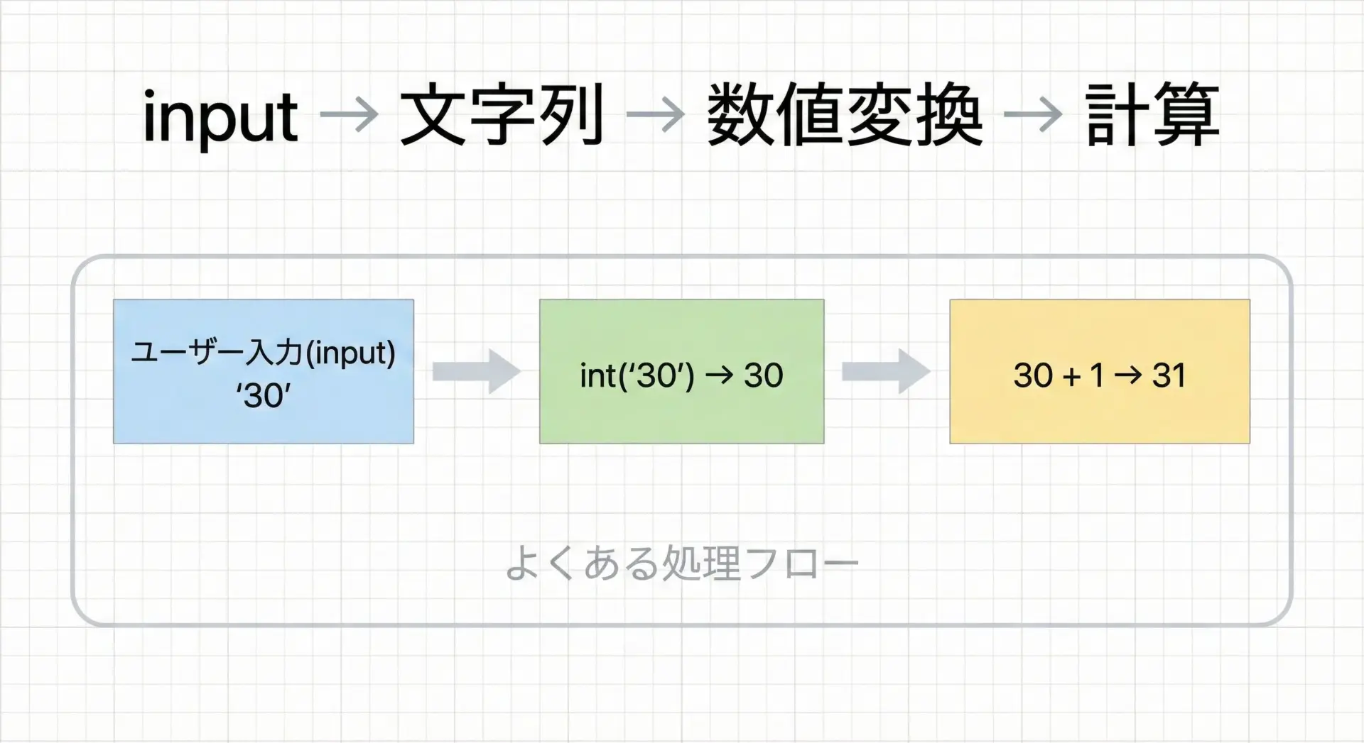 よくあるパターンとして、ユーザー入力input()の結果は必ず文字列になるため、そのままでは計算できません。