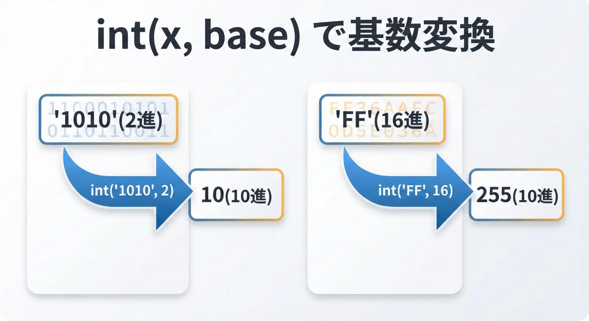 int()は第2引数に基数(base)を指定することで、2進数や16進数など、さまざまな表現から10進数の整数に変換できます。