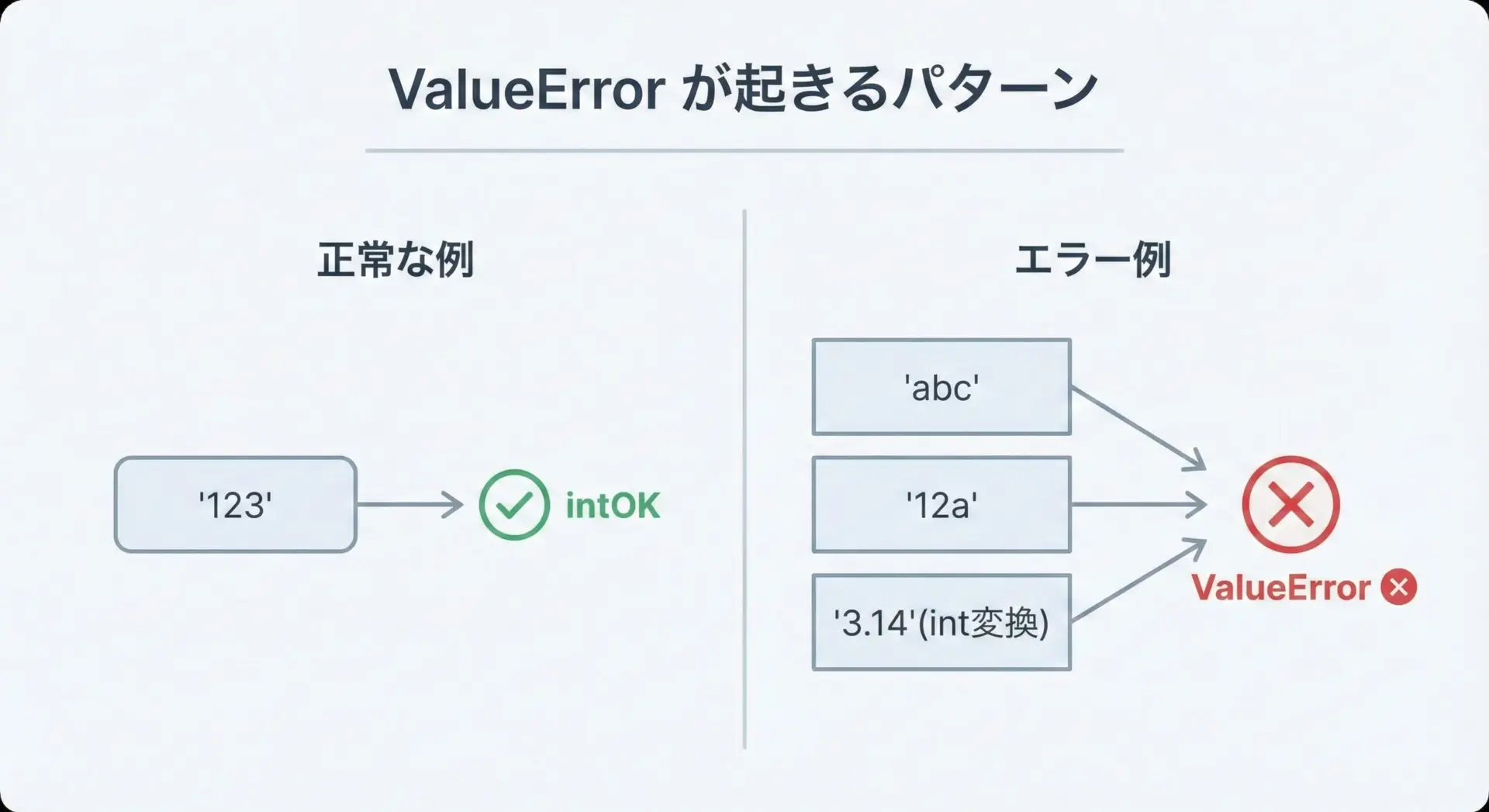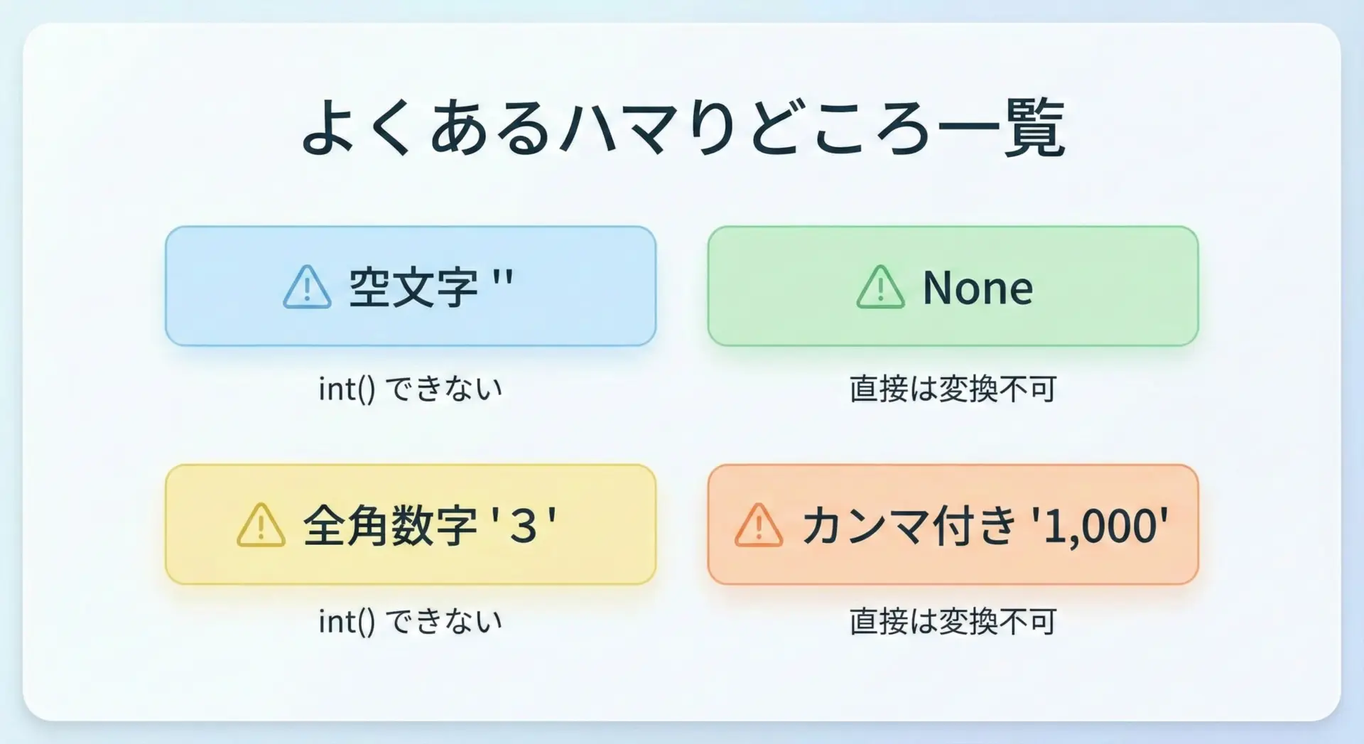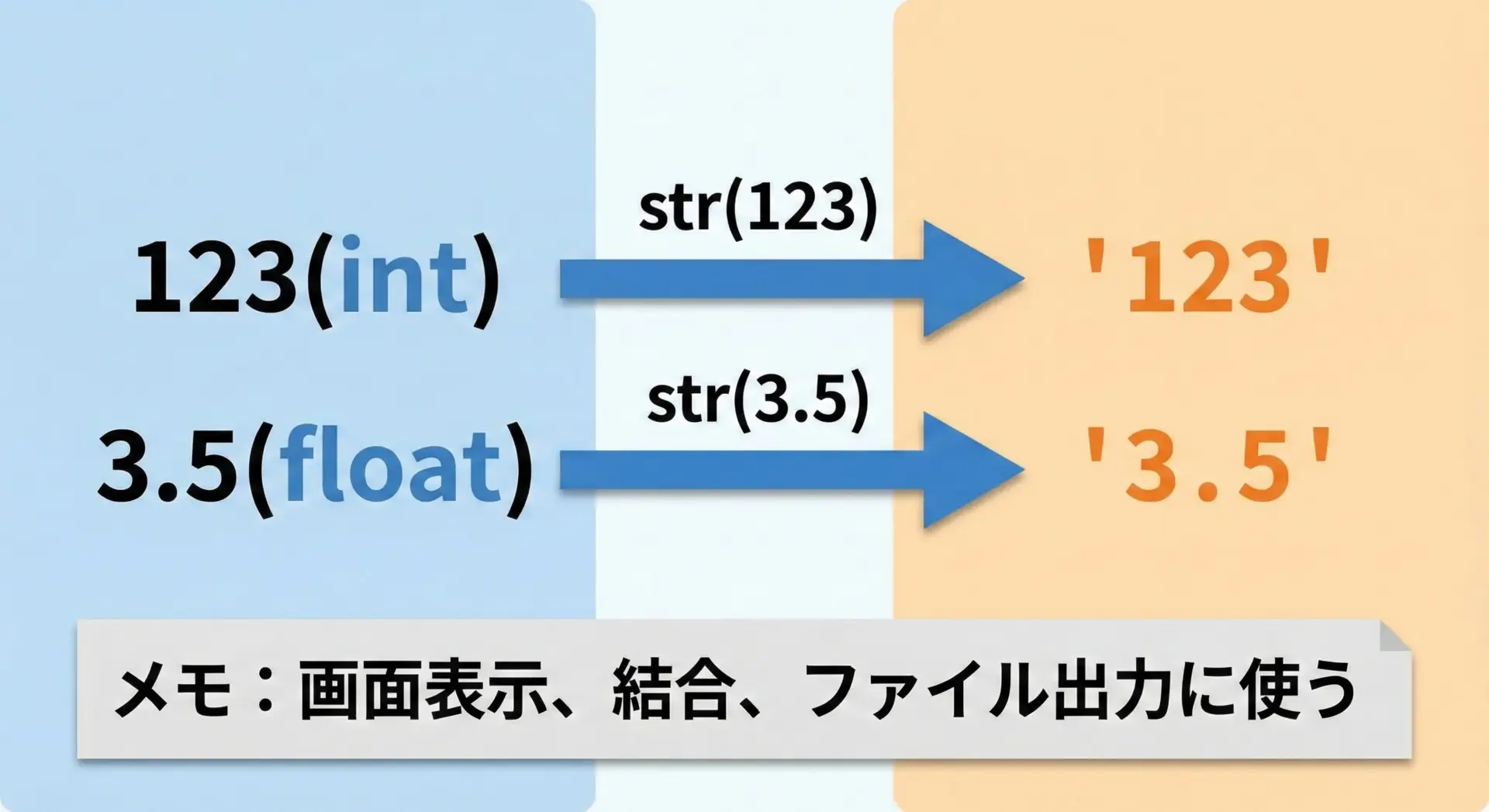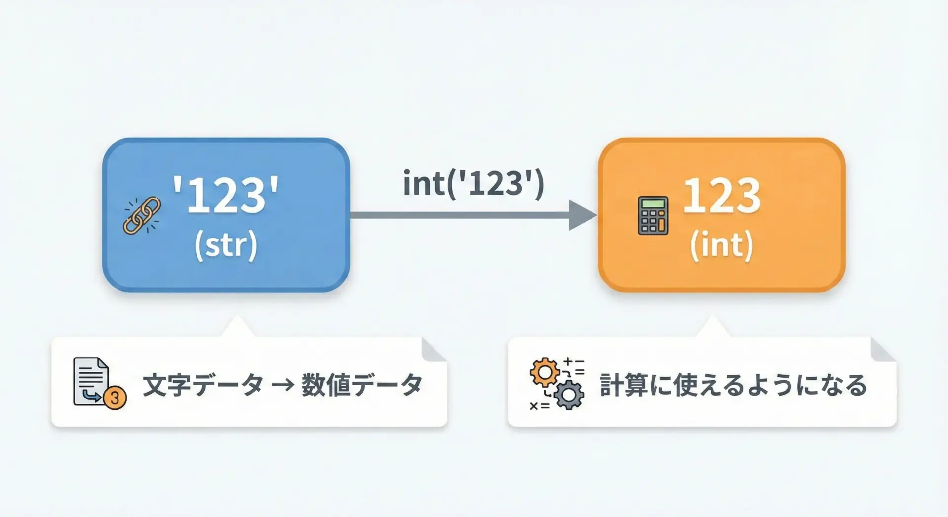 このように見た目は同じでも、型がstrからintへ変わることで、足し算や比較などの数値演算が可能になります。