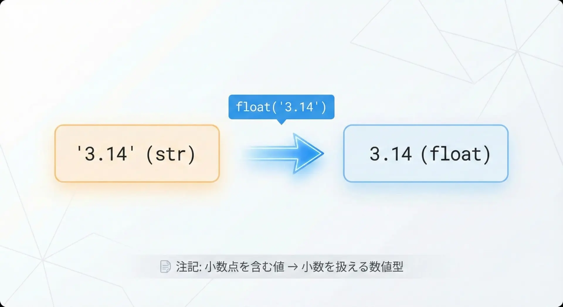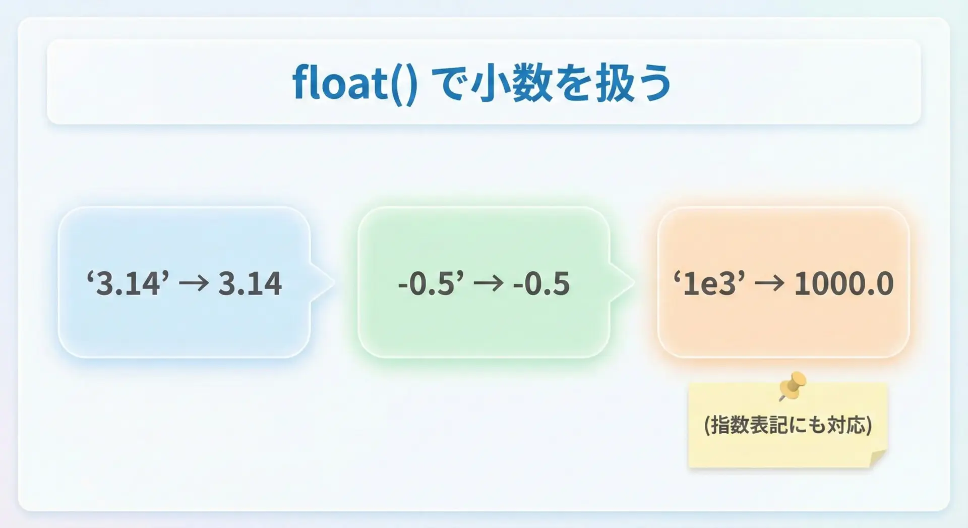 float()を使うと、小数点や指数表現を含んだ文字列も変換できます。