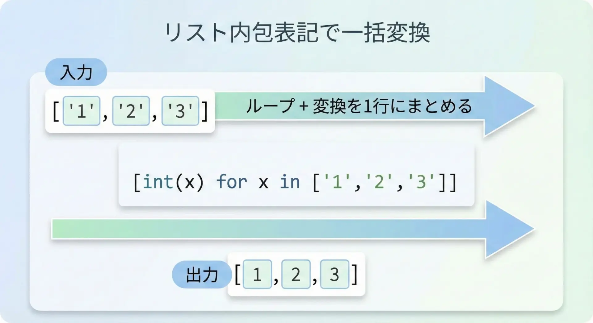 複数の文字列数値をまとめて整数や小数に変換したいときには、リスト内包表記が便利です。