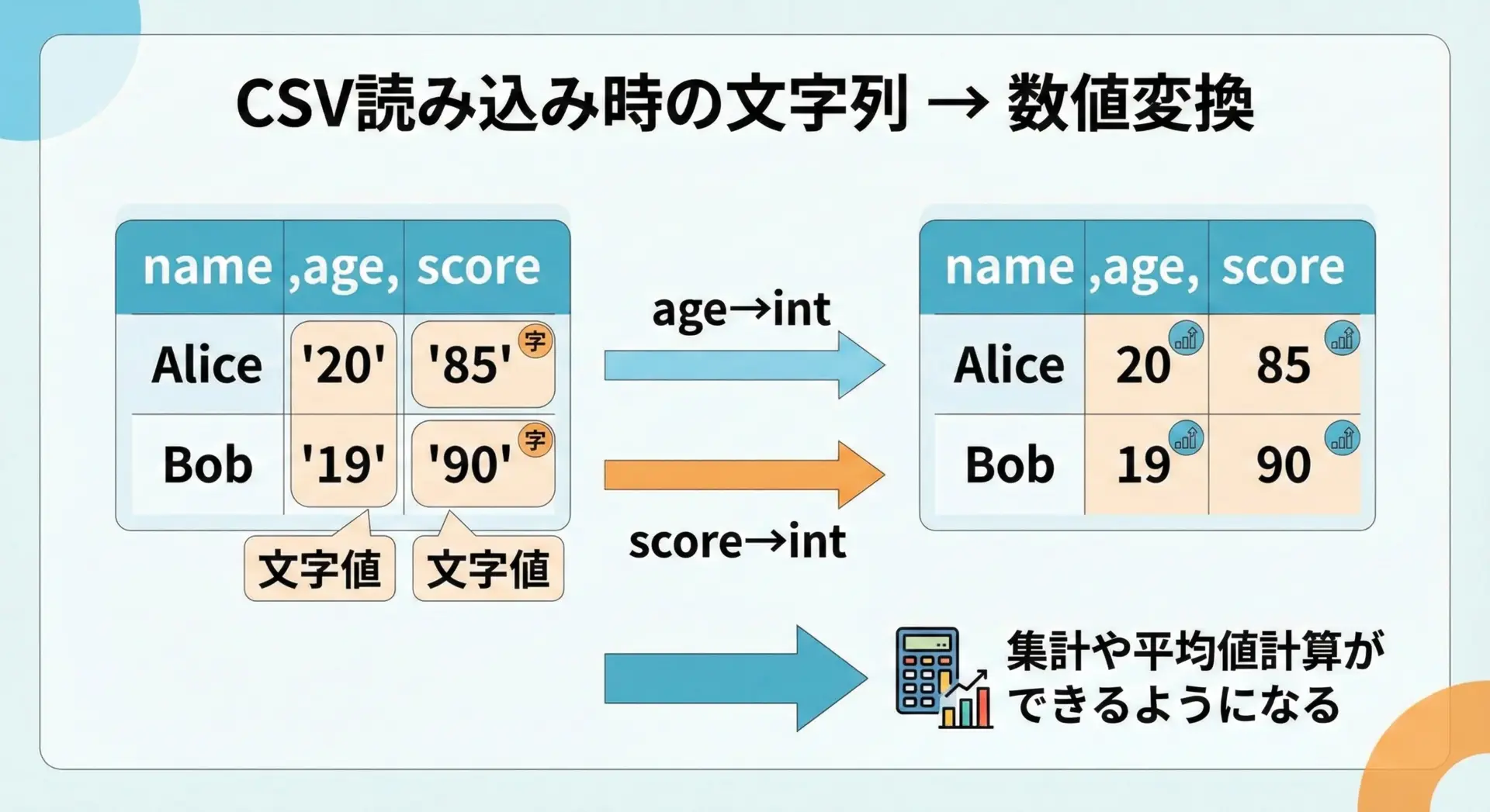 ファイル(CSVなど)から読み込んだデータは、基本的に全て文字列として扱われます。