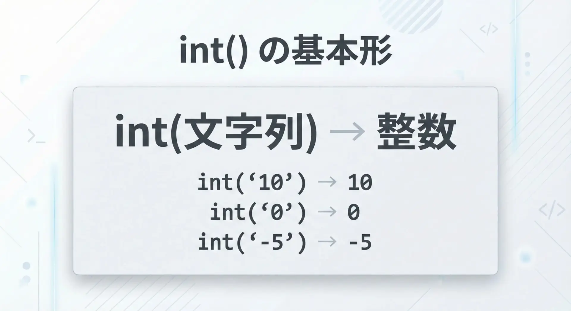 Pythonでは、文字列を整数に変換するにはint()関数を使います。