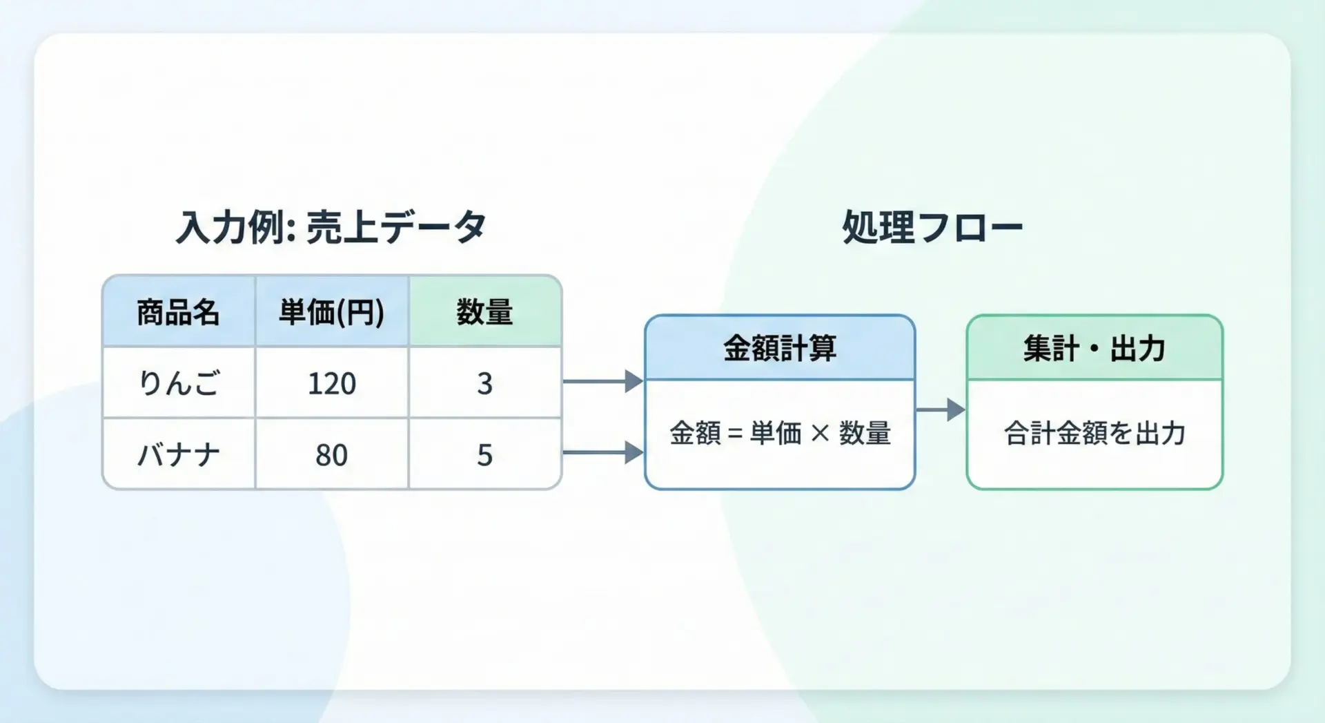 ここでは、文字列として与えられた単価と数量から、商品ごとの金額と合計金額を計算します。