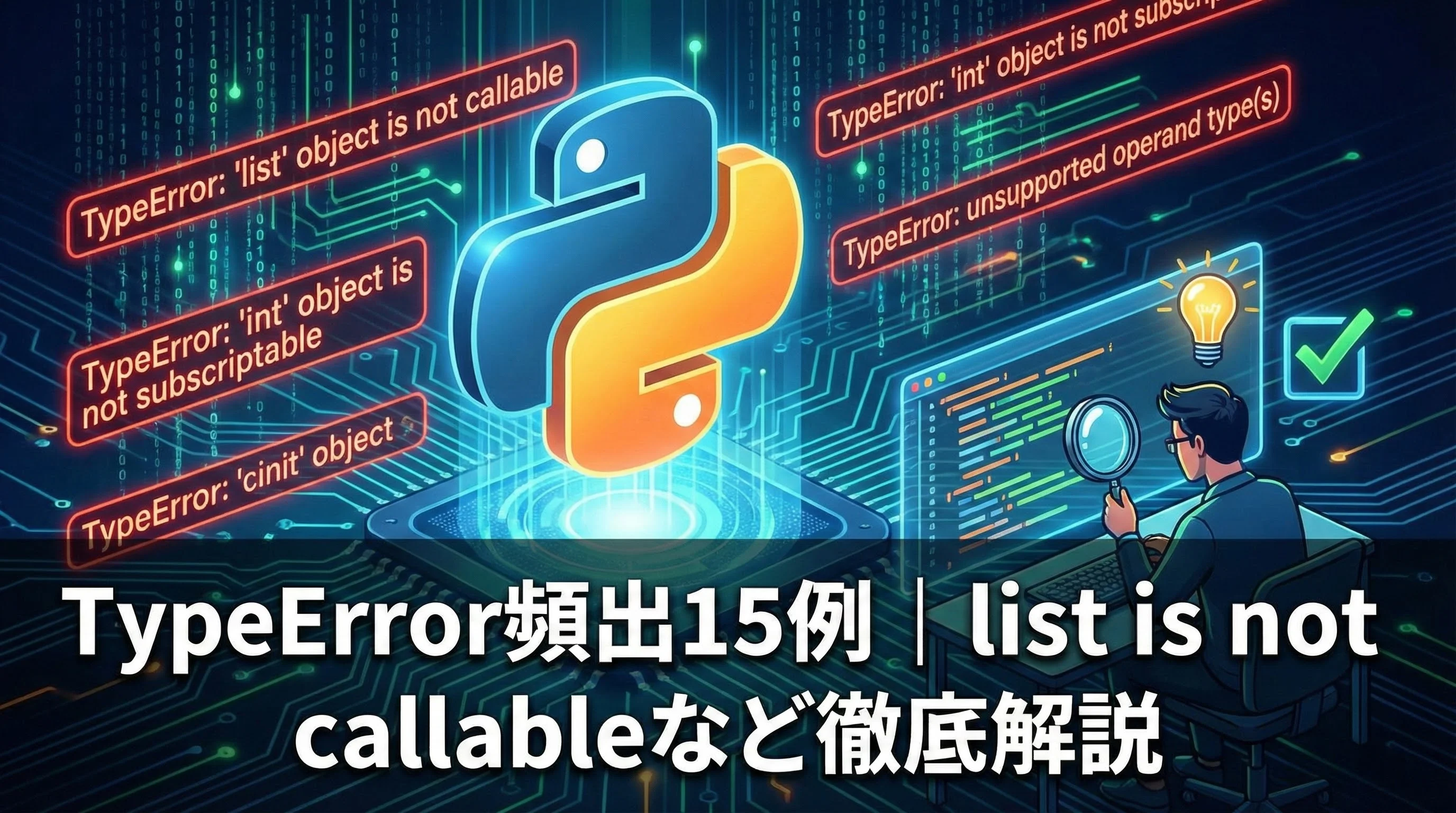 本記事では、PythonのTypeErrorの基本から、頻出パターン15例、そして「list is not callable」を中心に、原因の読み解き方と防ぎ方を丁寧に解説していきます。
