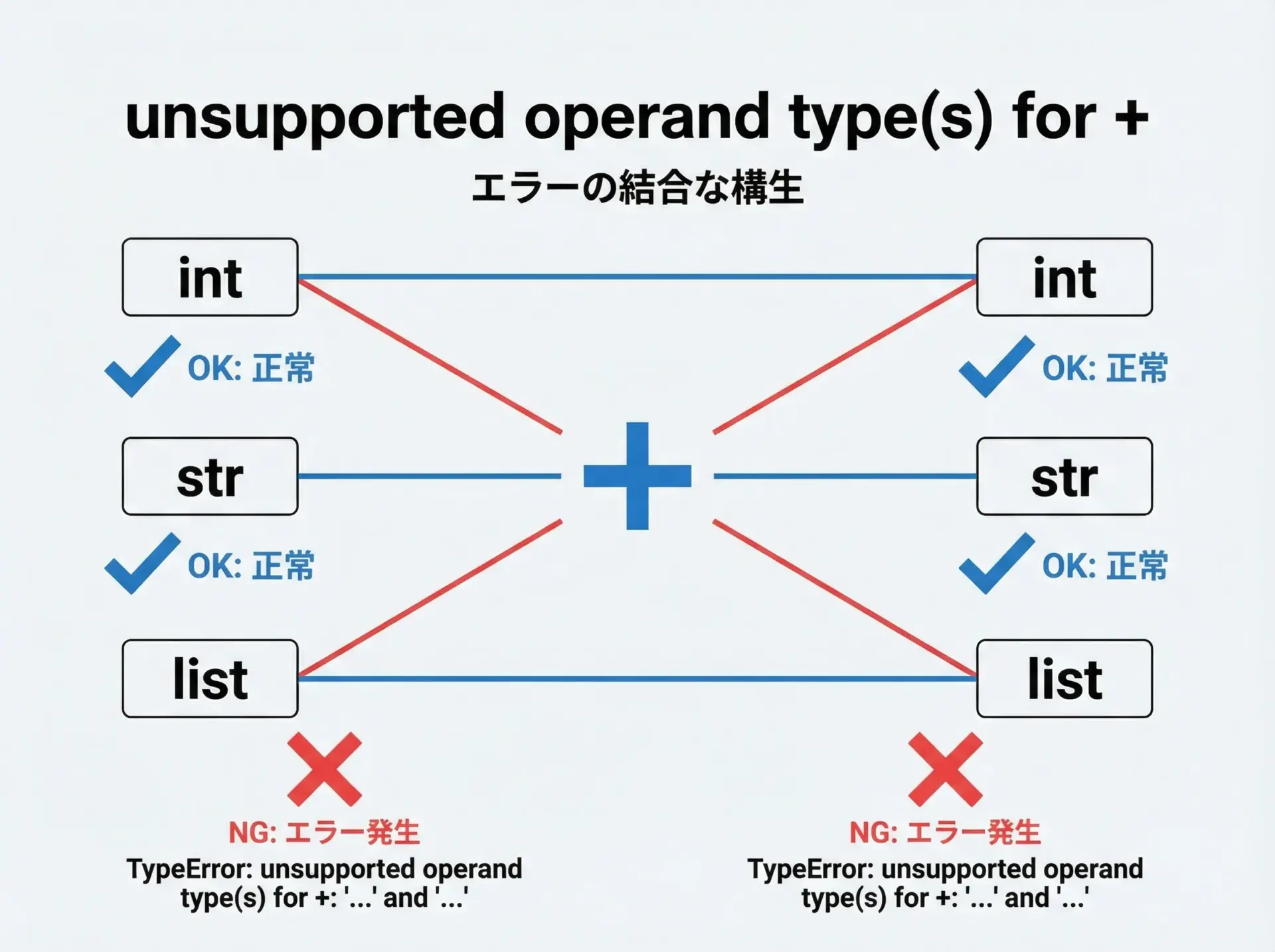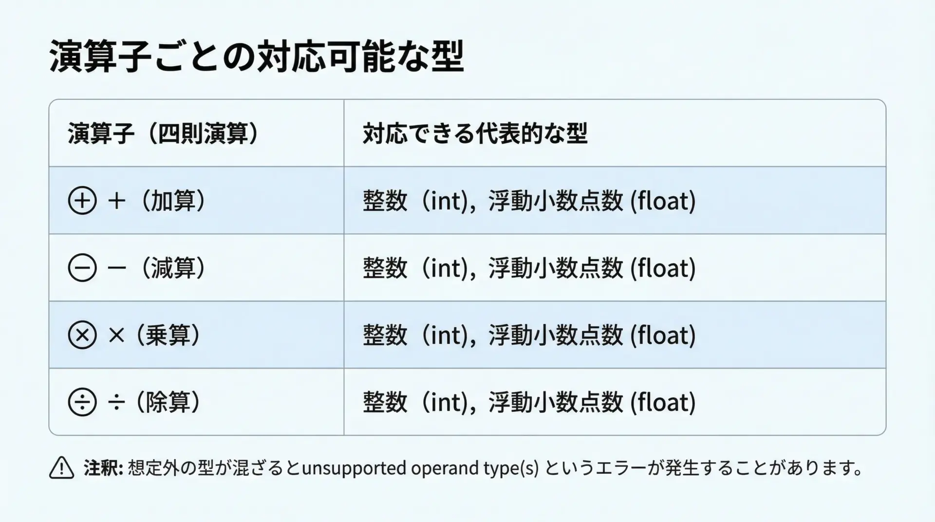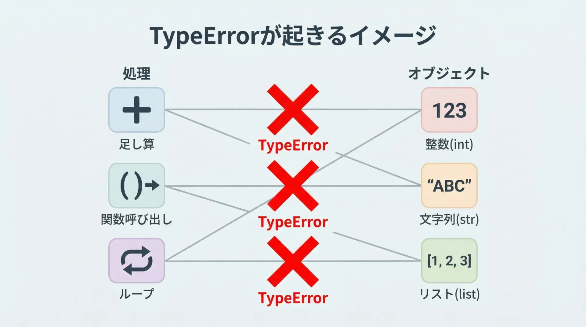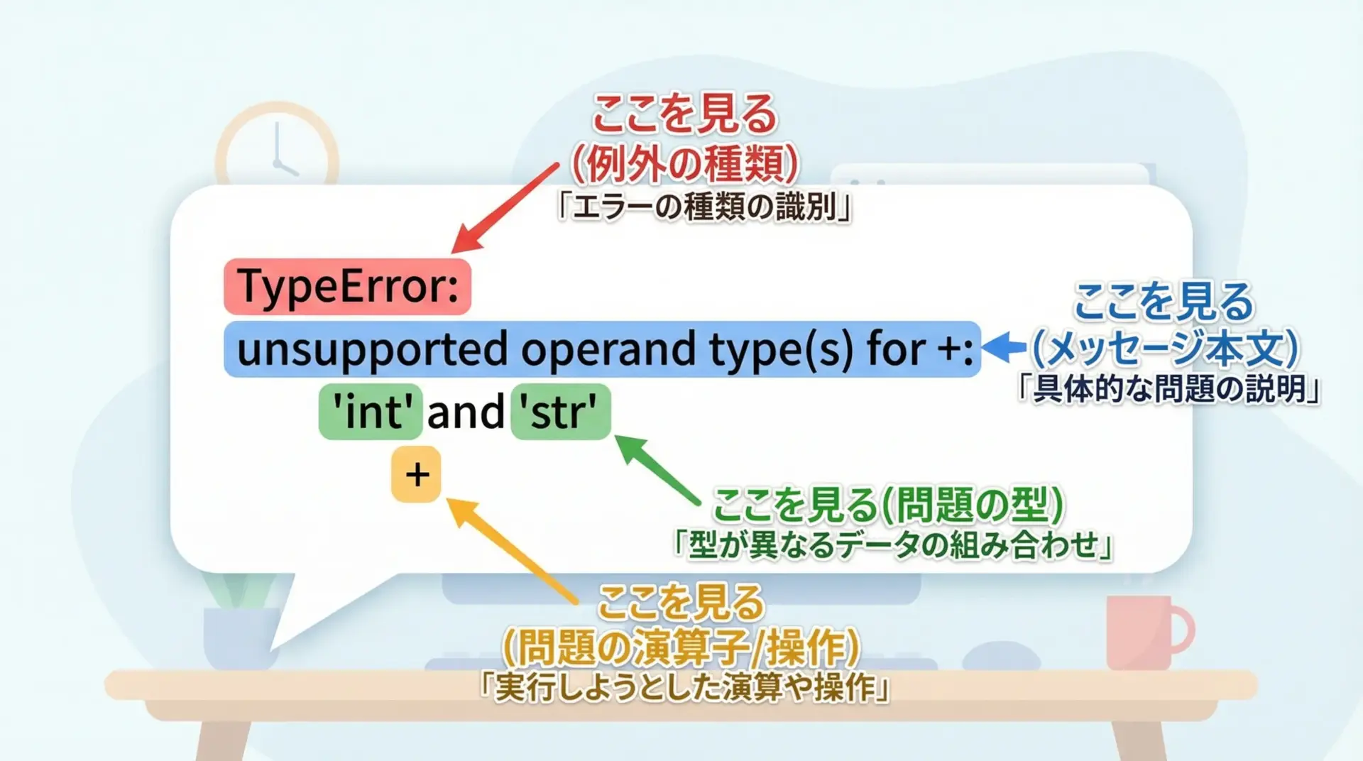 PythonのTypeErrorは、「型」と「操作」の組み合わせミスを教えてくれる重要なサインです。