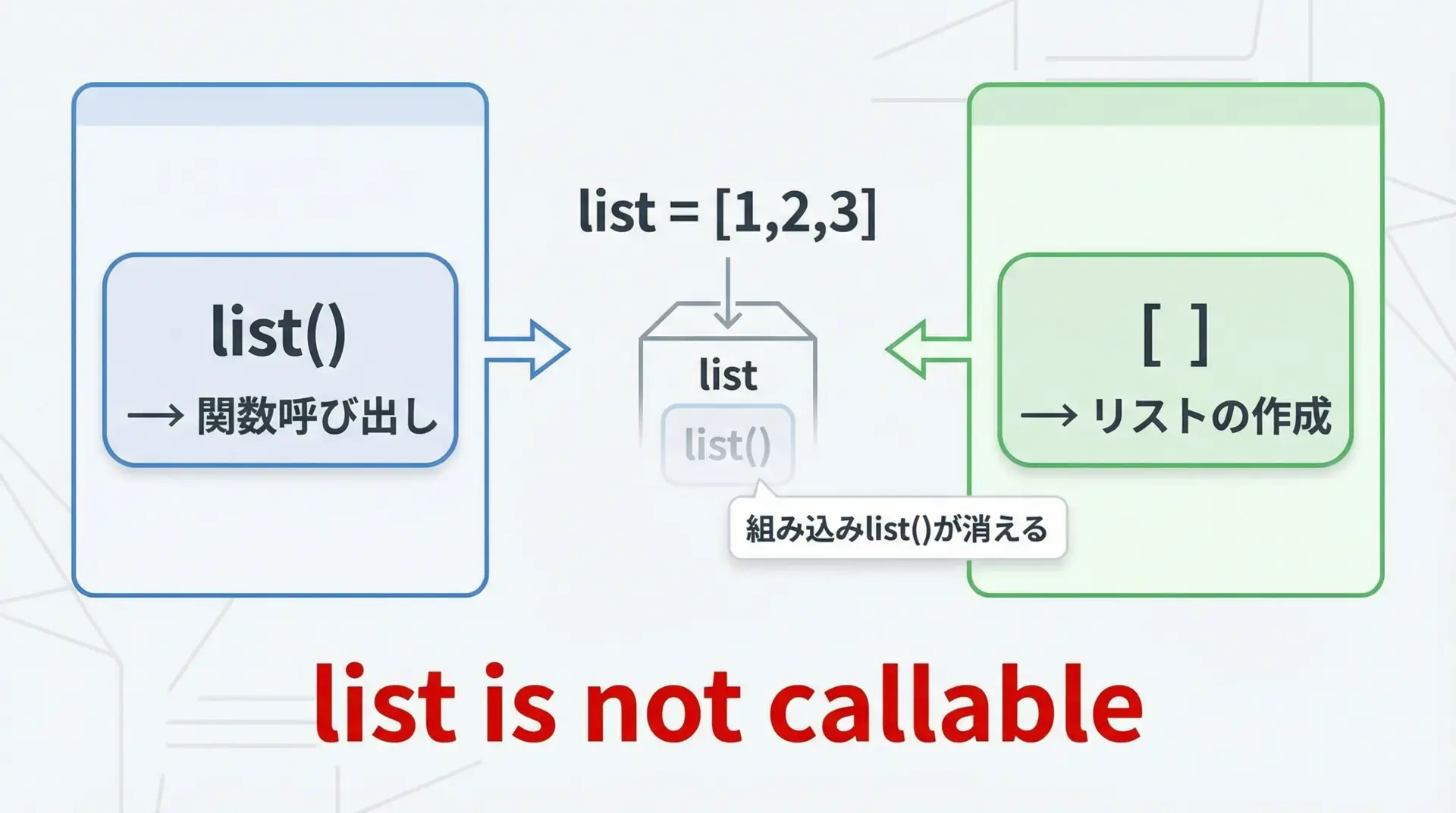 その状態でlist("123")と書くと、リストを関数のように呼び出そうとしてしまい、「リストは呼び出せません」と怒られるわけです。