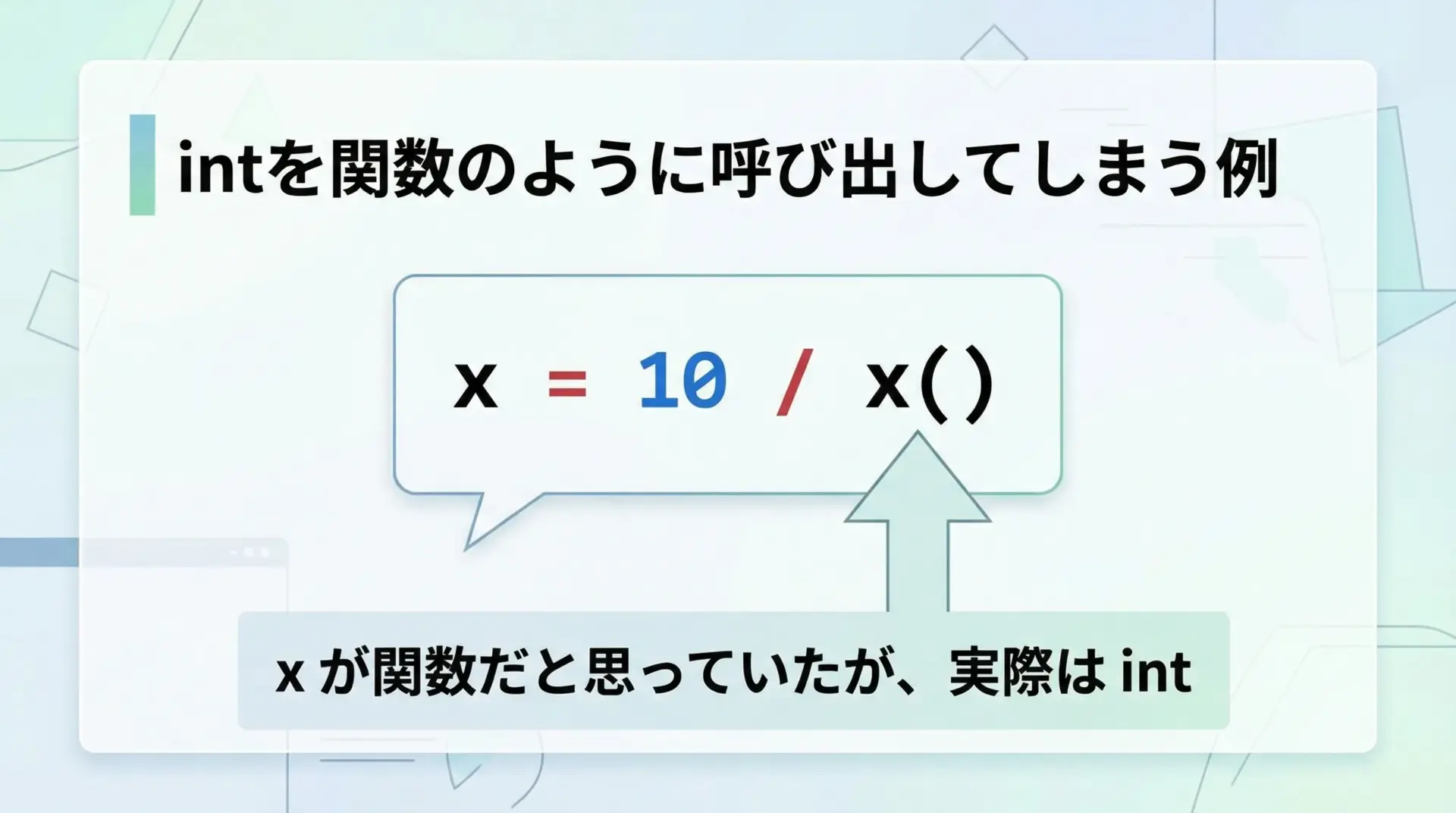 TypeError: ‘int’ object is not callableは、整数型のオブジェクトを関数のように()で呼び出そうとしたときに発生します。