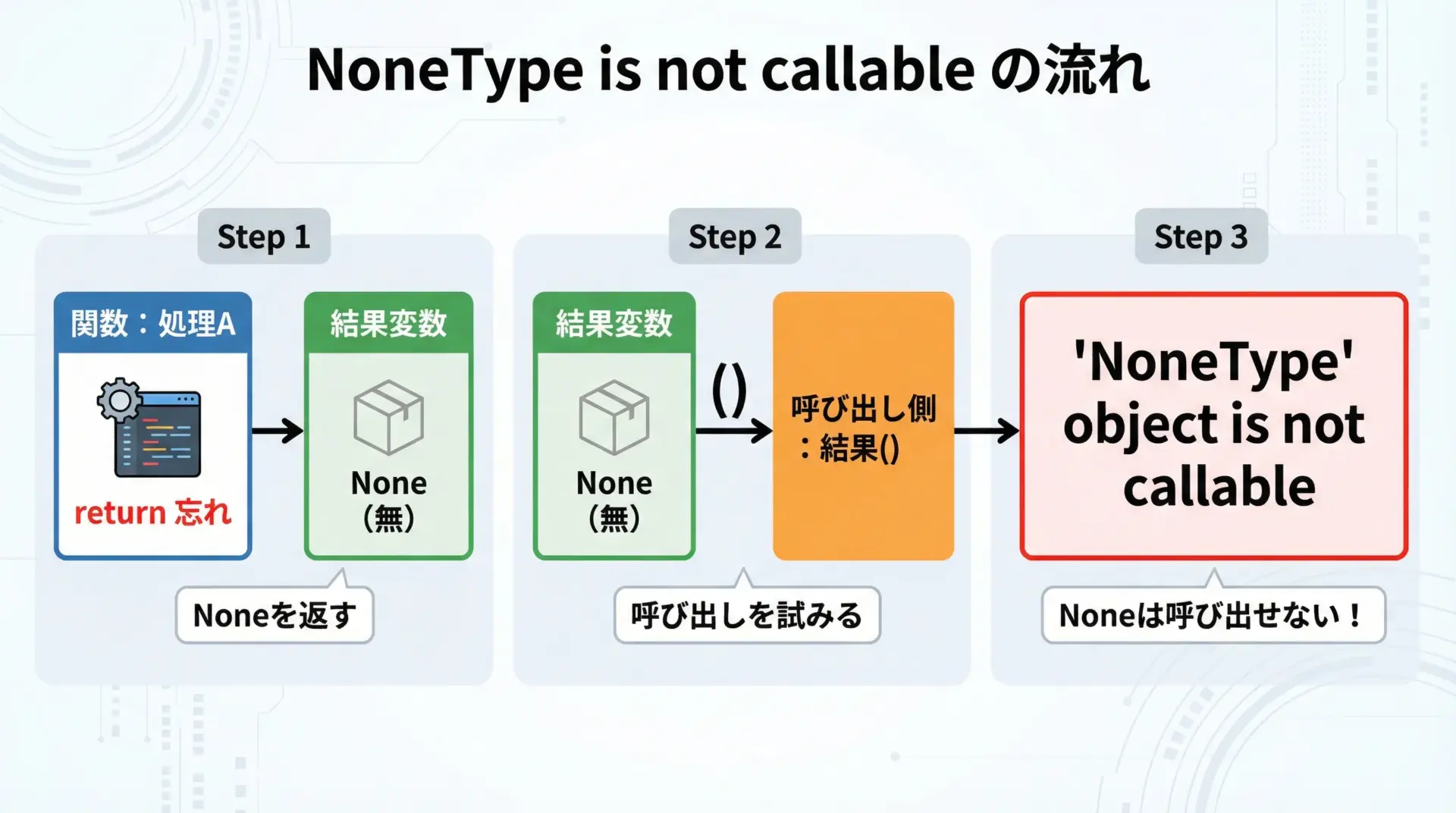 「list is not callable」や「’int’ object is not callable」など、頻出する15のパターンを理解しておくと、エラーメッセージを見ただけで原因の見当がつくようになります