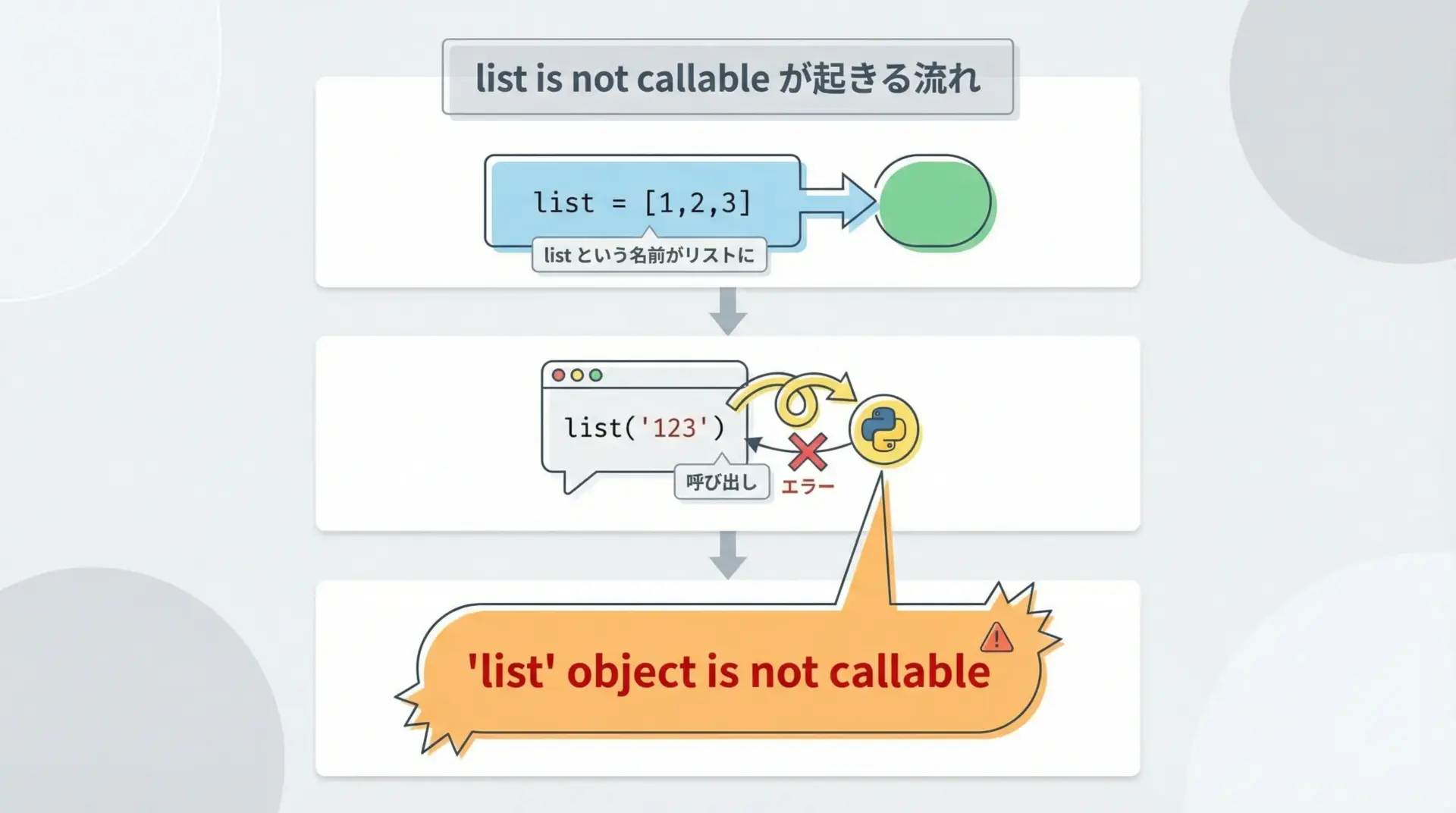 とくに「list is not callable」や「’int’ object is not callable」などのエラーは、初心者だけでなく中級者でもうっかり遭遇する代表例です。