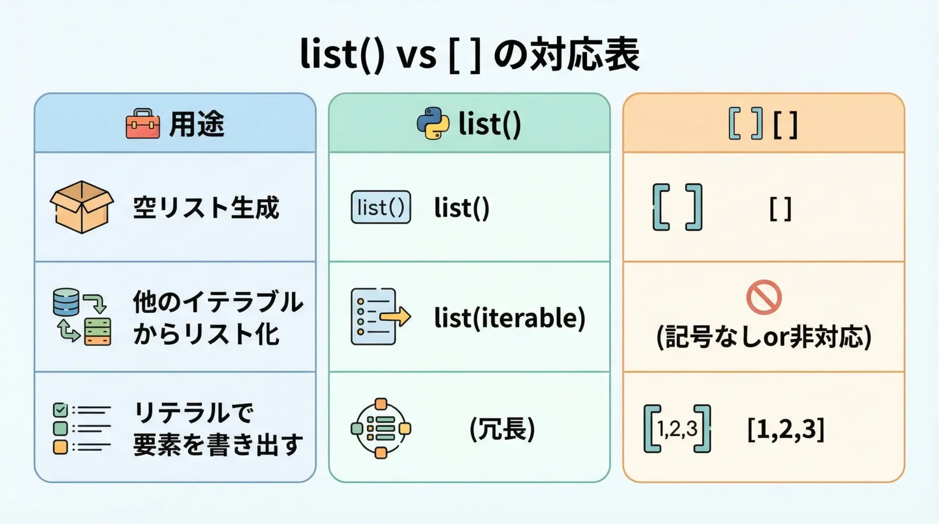 空リストを作るときは[]を使うのが一般的で、他のイテラブルからリストを作りたいときにlist()を使うと覚えておくとよいです。