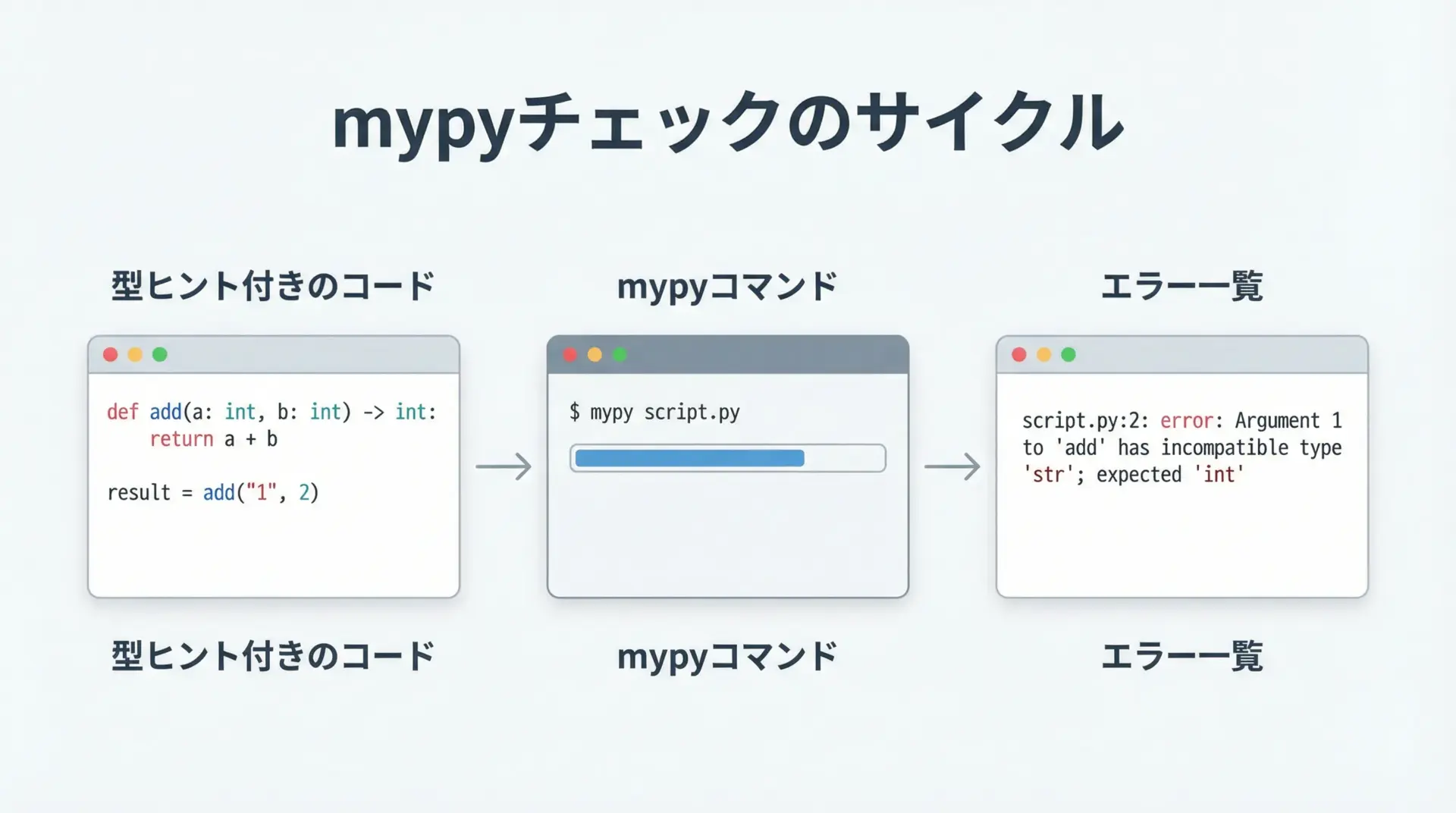 このように、型ヒントと静的チェックを導入しておくと、「本来はintを期待している関数にstrを渡している」といったミスを早い段階で見つけることができます