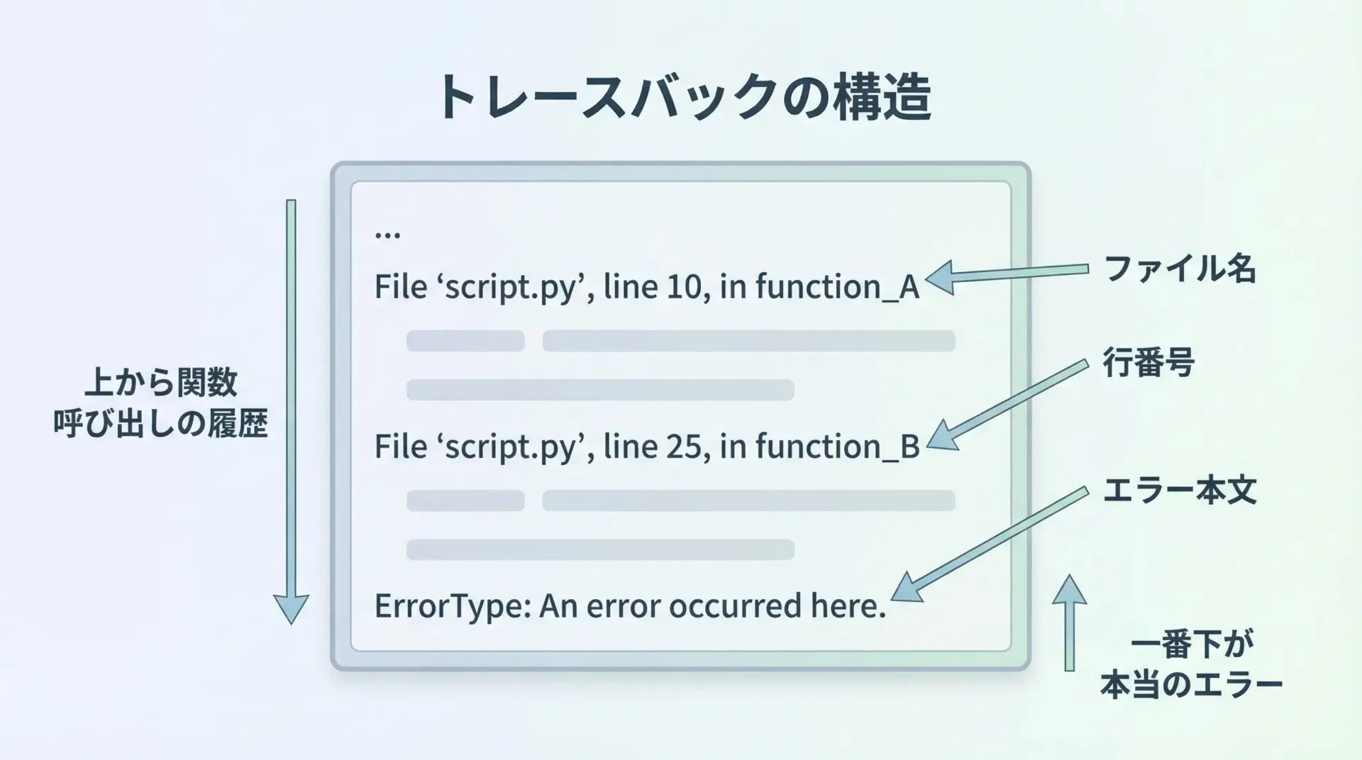 最後に、TypeErrorに限らずPythonのエラー全般で重要なのが、トレースバック(traceback)の読み方です。