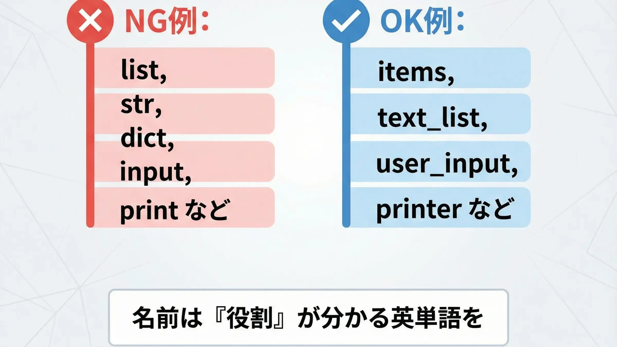 たとえばリストならitems, numbers, user_listなど、「何のリストか」が分かる名前にすると、組み込み名との衝突も避けやすくなります。