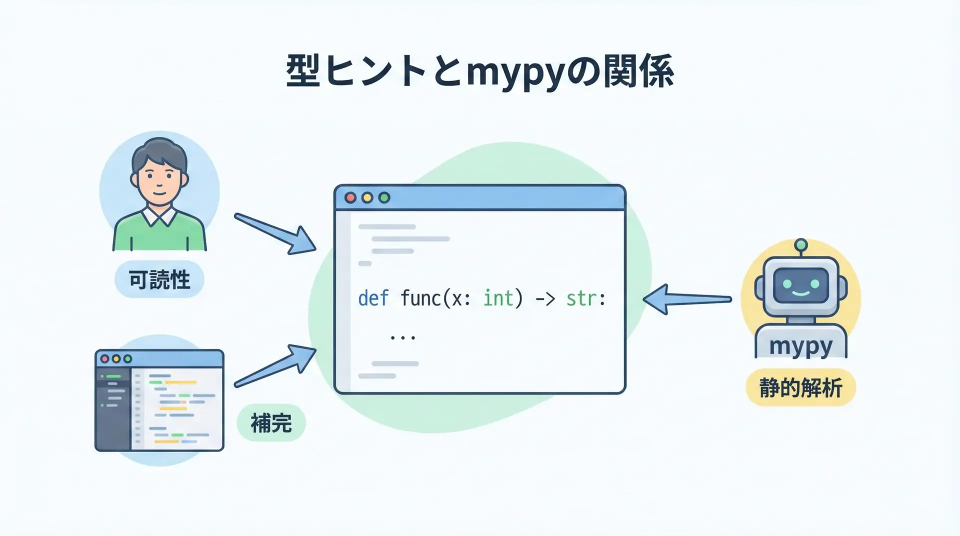 このため、型ヒントを正しく理解することは、mypyを活用するうえで欠かせない前提知識になります。