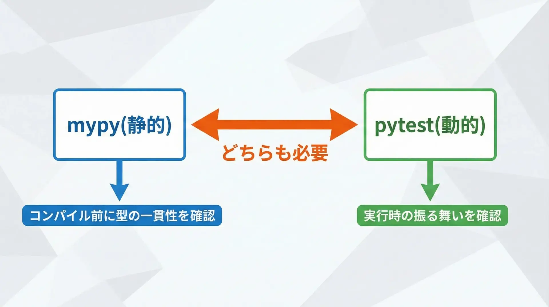 mypyとPytestは、どちらも品質向上のためのツールですが、役割は明確に異なります。
