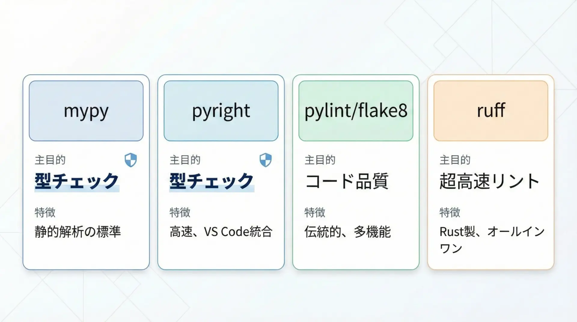 このため、mypyを「型」、ruffなどを「スタイル」として併用する構成がよく採用されます。