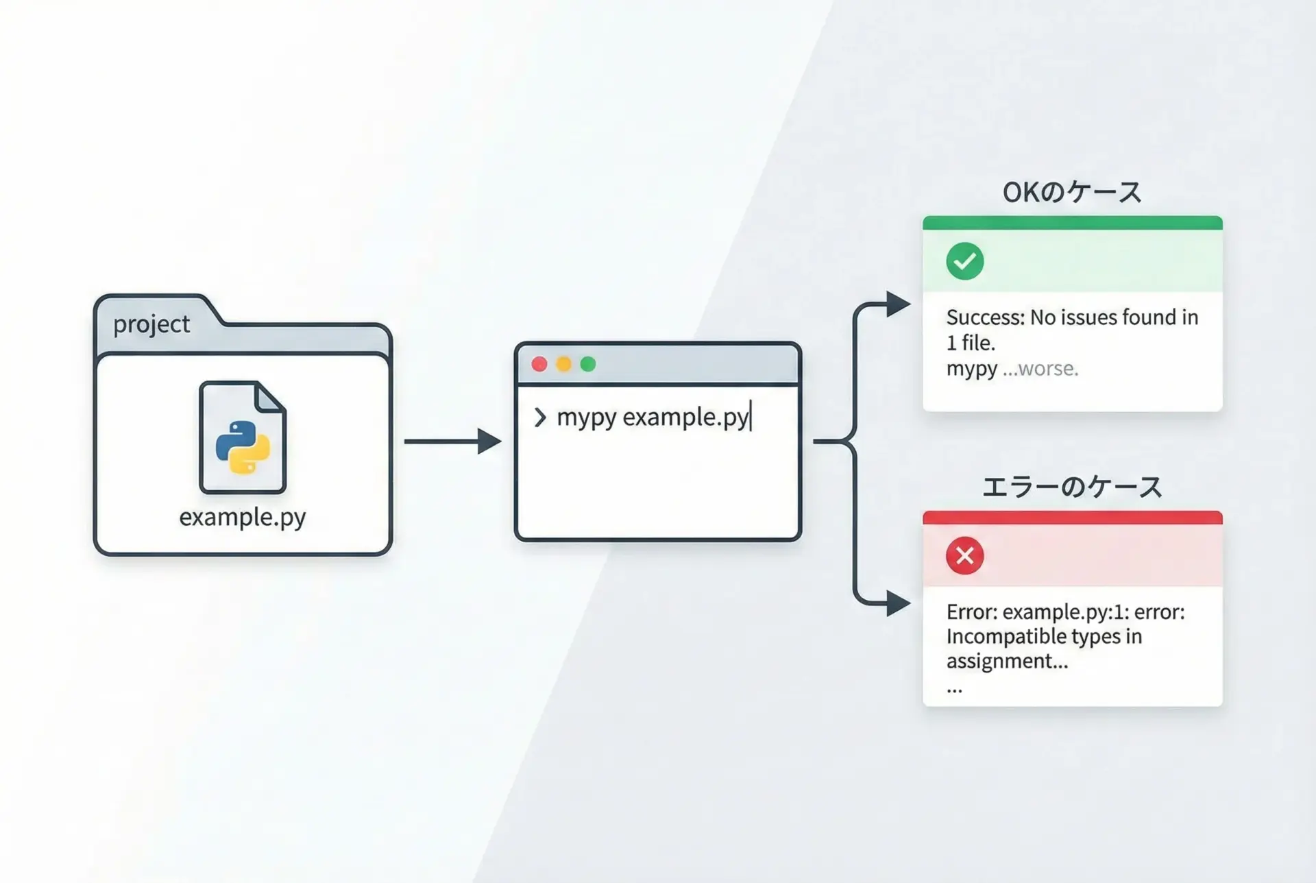 mypyの基本的な使い方は非常にシンプルで、「対象のPythonファイルに対してmypyコマンドを実行する」だけです。