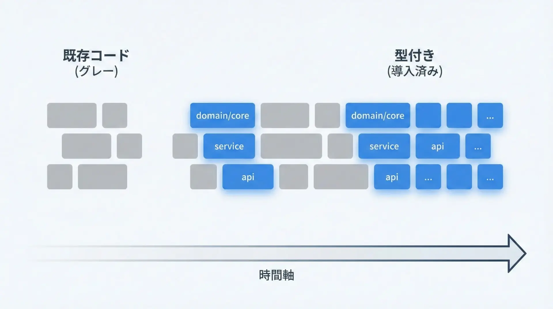 次に、ビジネスクリティカルなモジュールや、変更頻度の高いモジュールから優先的に型を充実させていきます。
