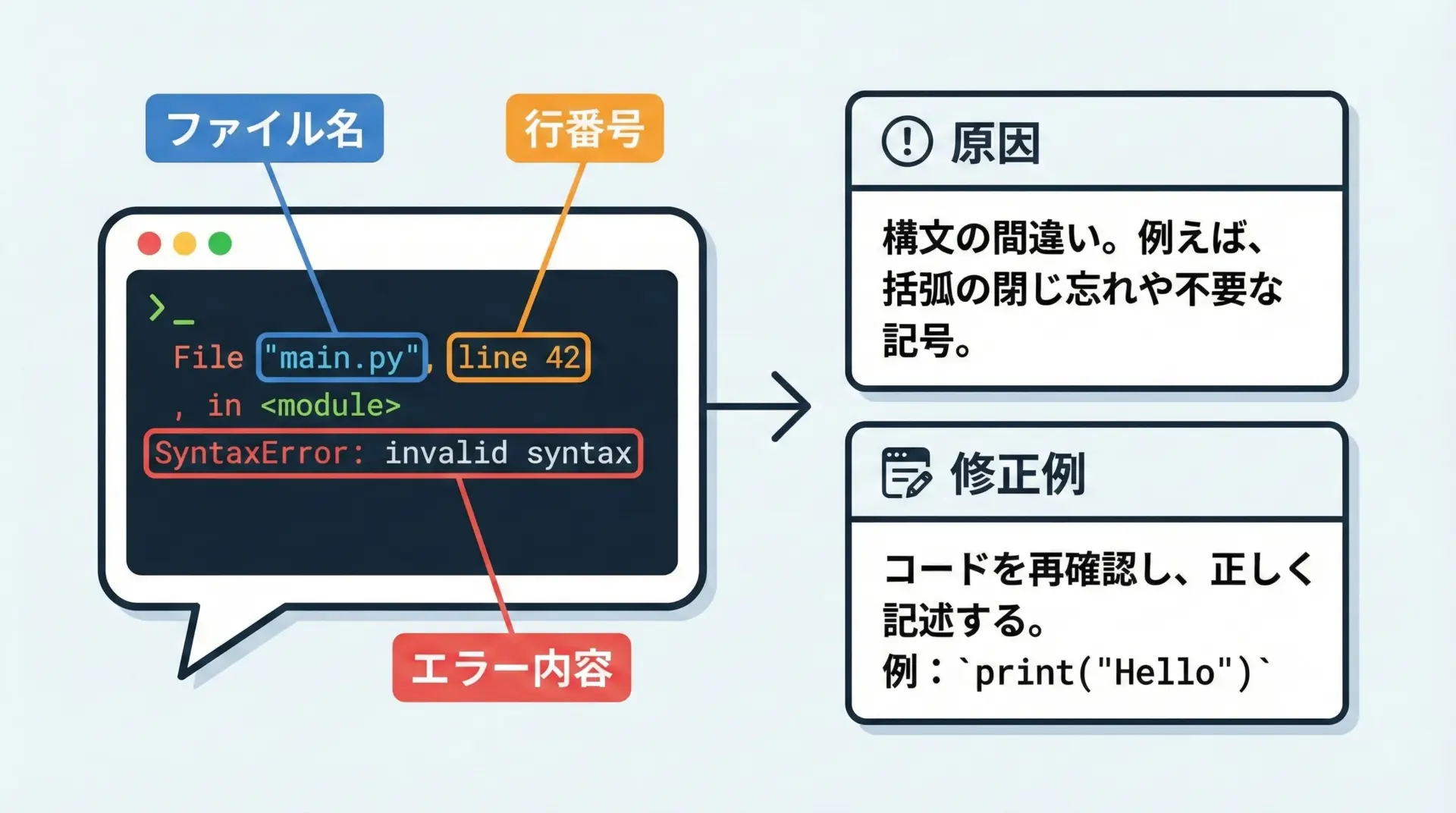 典型的なエラー例と対処法をいくつか見てみましょう。