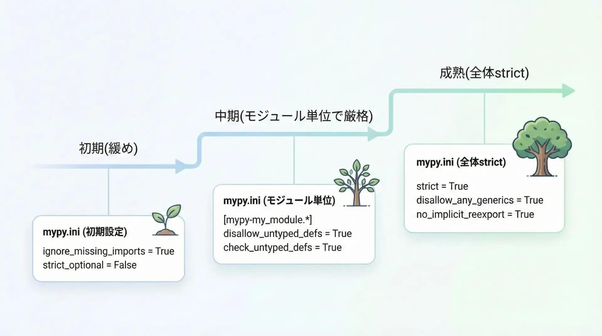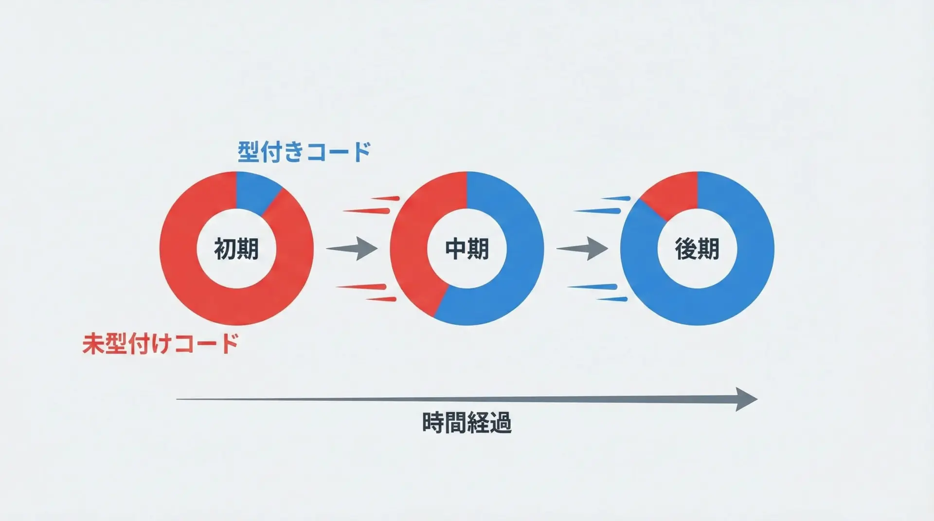 最後に、新規コードへは原則として完全な型注釈を要求し、「古いコードは触るときに型を付ける」方針を徹底することで、時間とともに全体の型カバレッジが自然と上がっていきます。