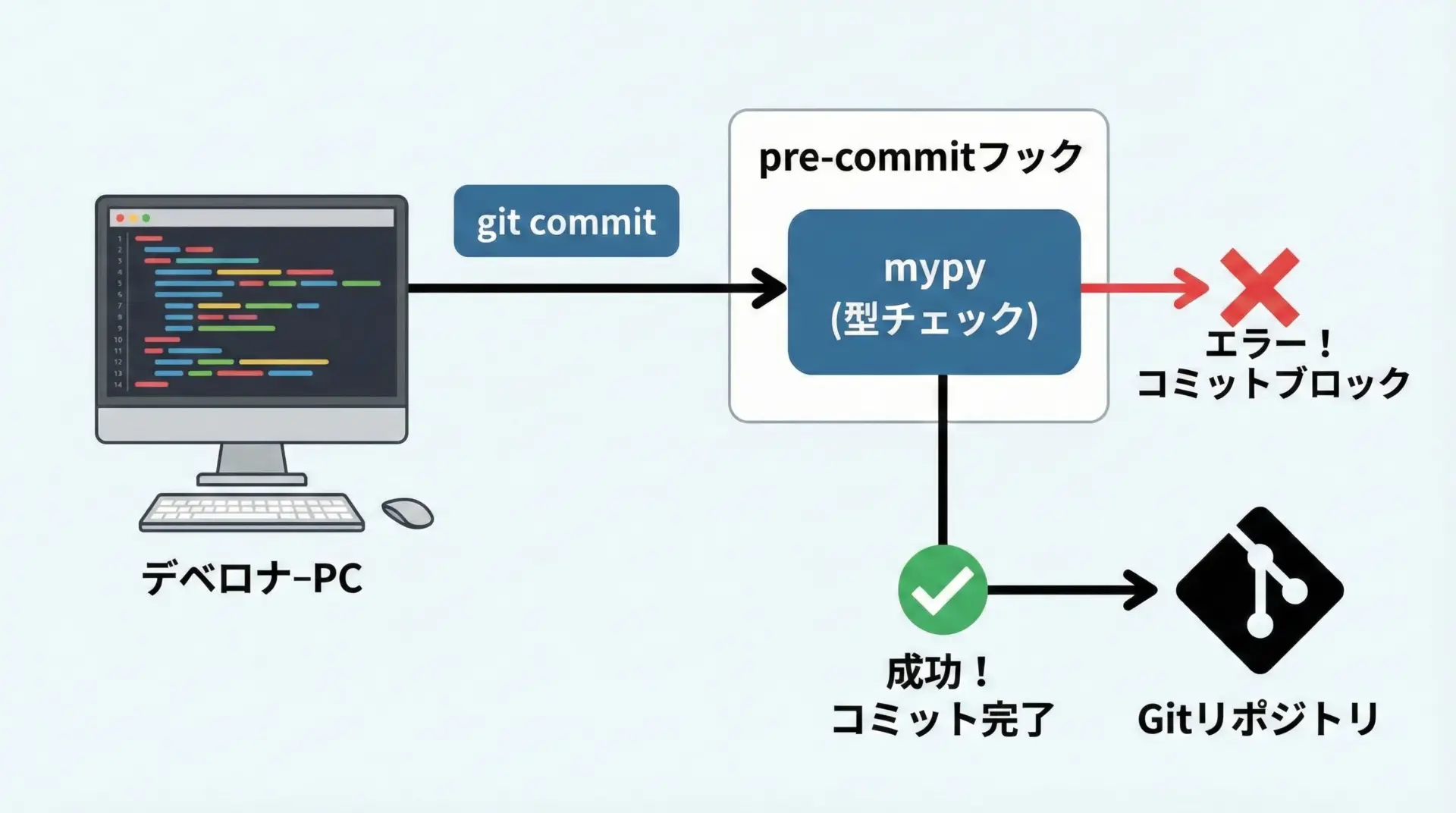 これでgit commitのたびに自動的にmypyが走るようになり、型エラーを含む変更がコミットされるのを防げます。