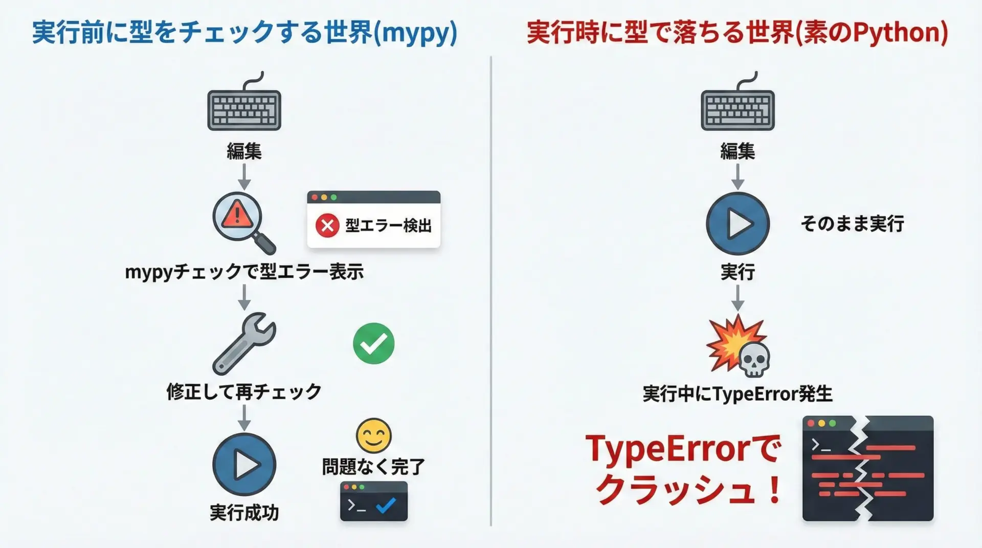 コードを書いたあと、mypyで型チェックを行い、実行する前に「あり得ない型の組み合わせ」を検出します。