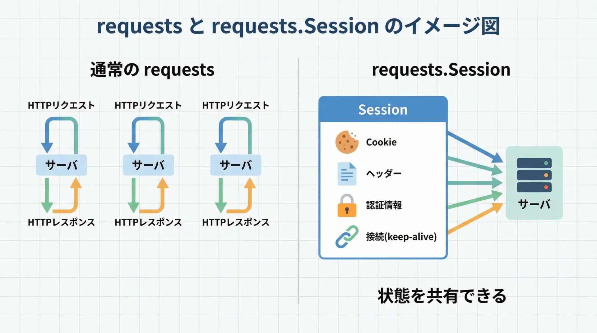 このようにrequests.Sessionは、「状態を持つHTTPクライアント」として扱うとイメージしやすいです。