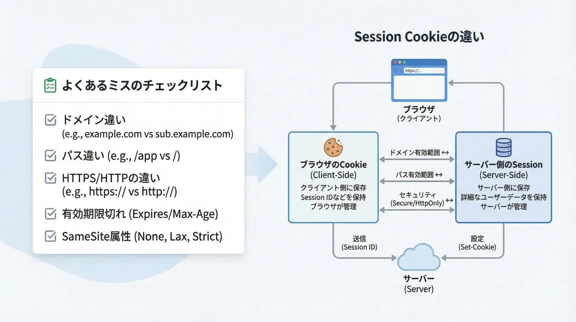 Sessionを使っているのにCookieが引き継がれていないように見える場合、次のようなポイントを確認すると原因を特定しやすくなります。