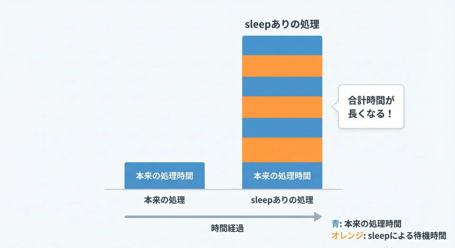 例えば、1秒のsleepを100回ループの中で行うと、それだけで最低でも100秒かかります。
