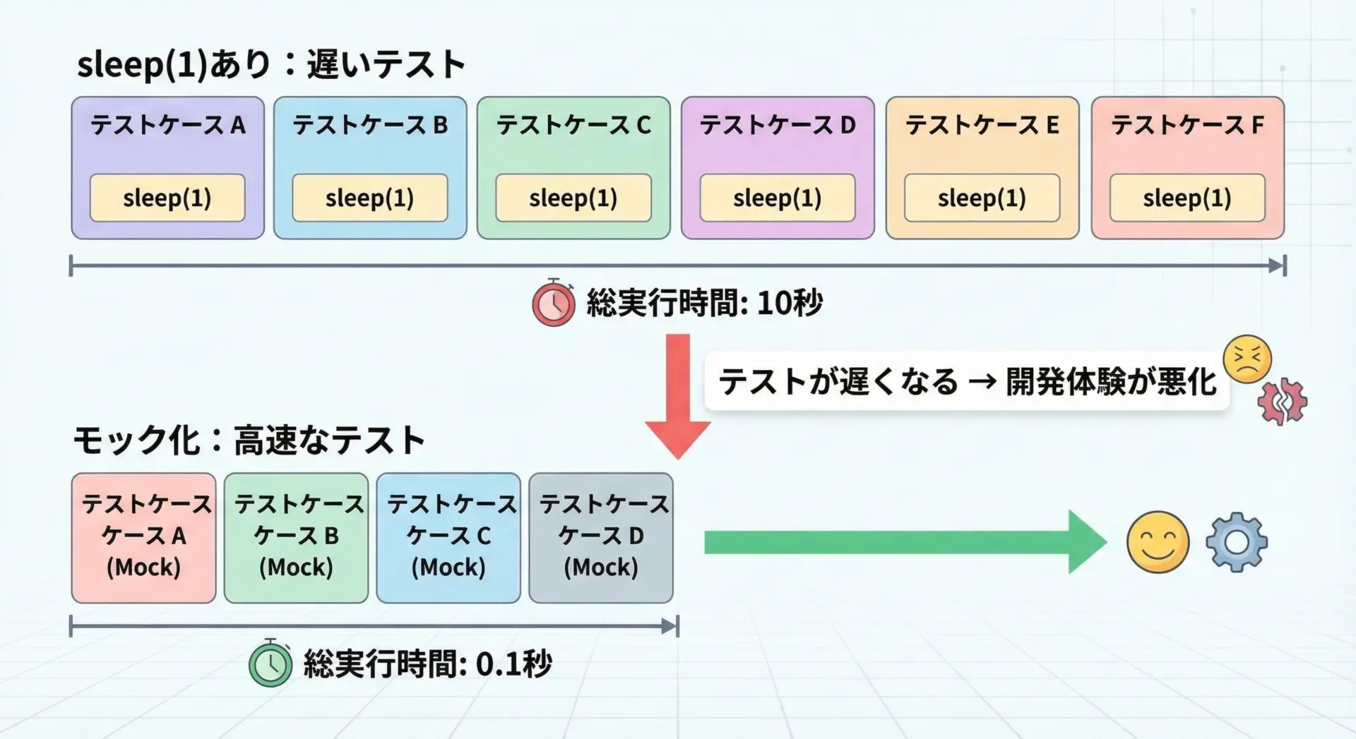 - sleepを直接呼ぶのではなく、「待機関数」を自作してそこをモック化する