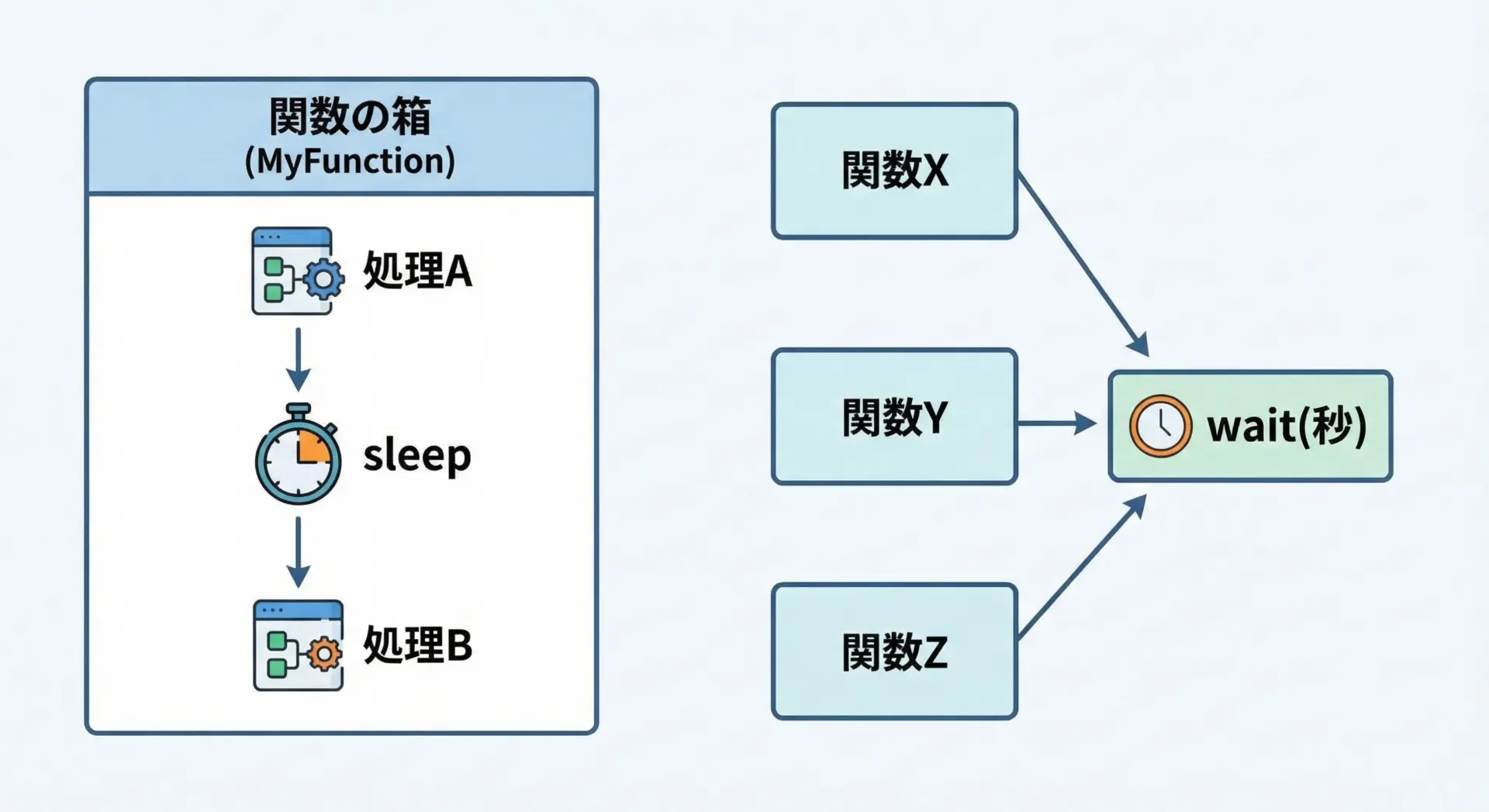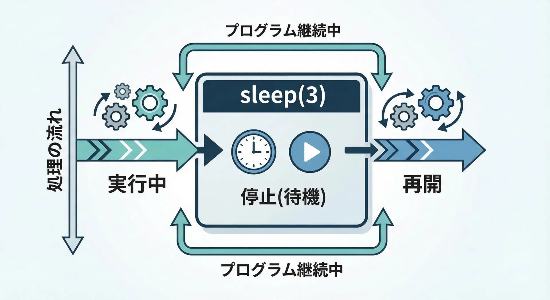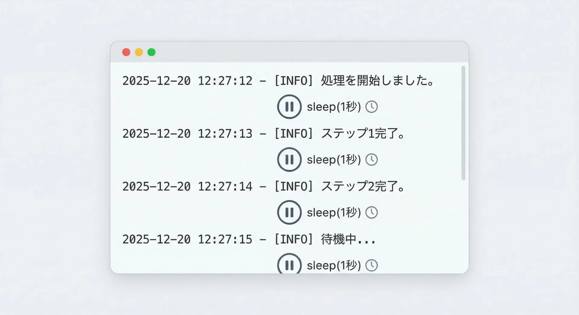 ループ処理の間隔調整や、APIアクセスの間隔制御、ログ出力の演出など、シンプルながら多くの場面で役立ちます。