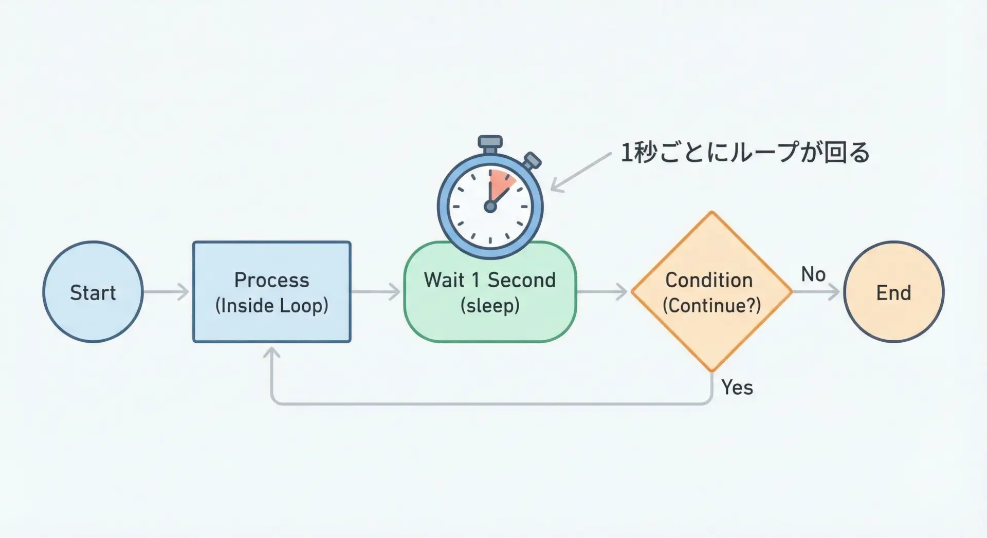 必要に応じて、time.time()などを組み合わせて「厳密に1秒ごとに実行されるように補正する」といった実装もありますが、初心者のうちは単純なループ+sleepで挙動を理解すると良いです。