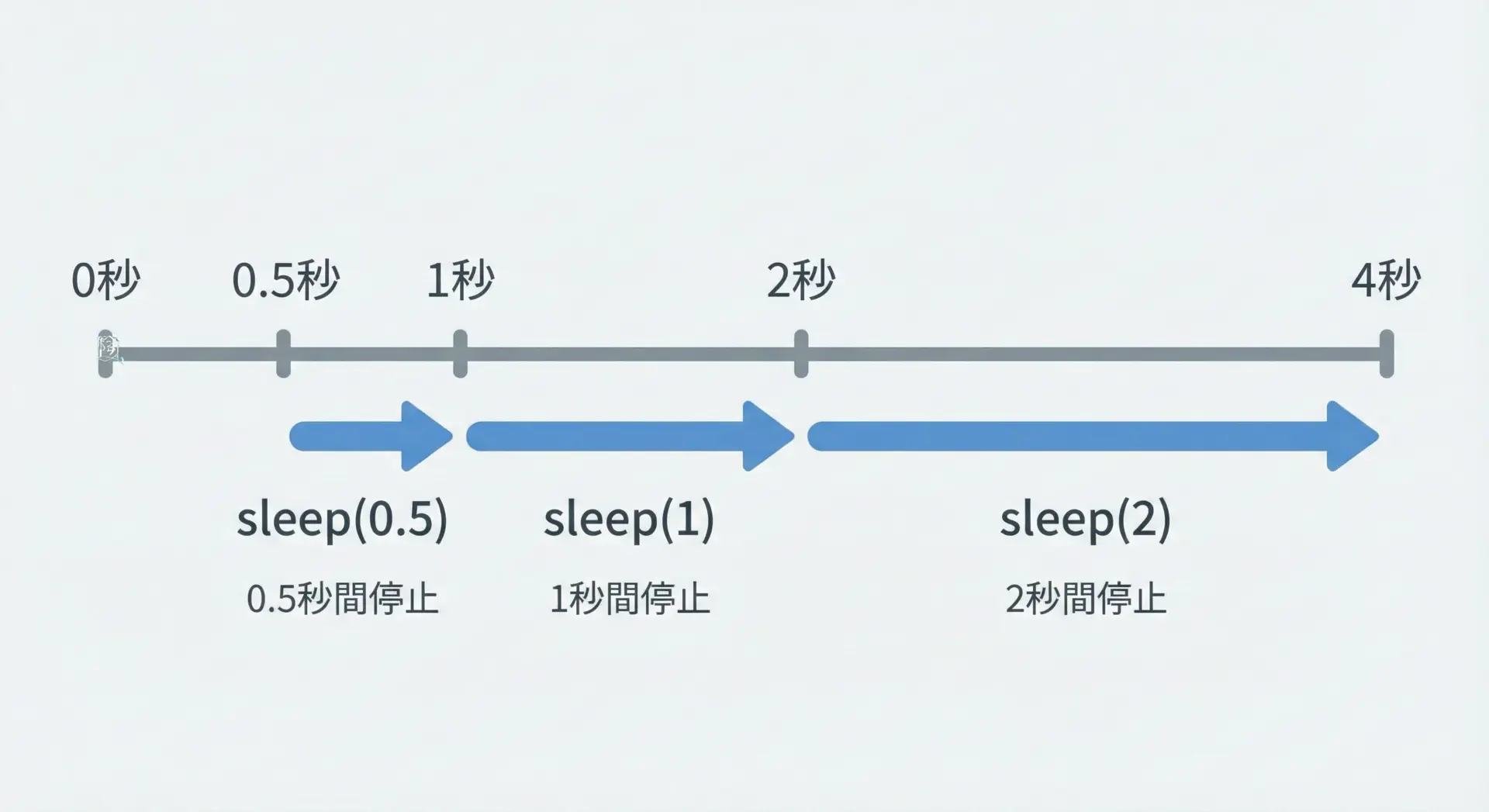 time.sleep(3)→ 3秒待機) - 浮動小数点数: 小数秒単位で待機 (