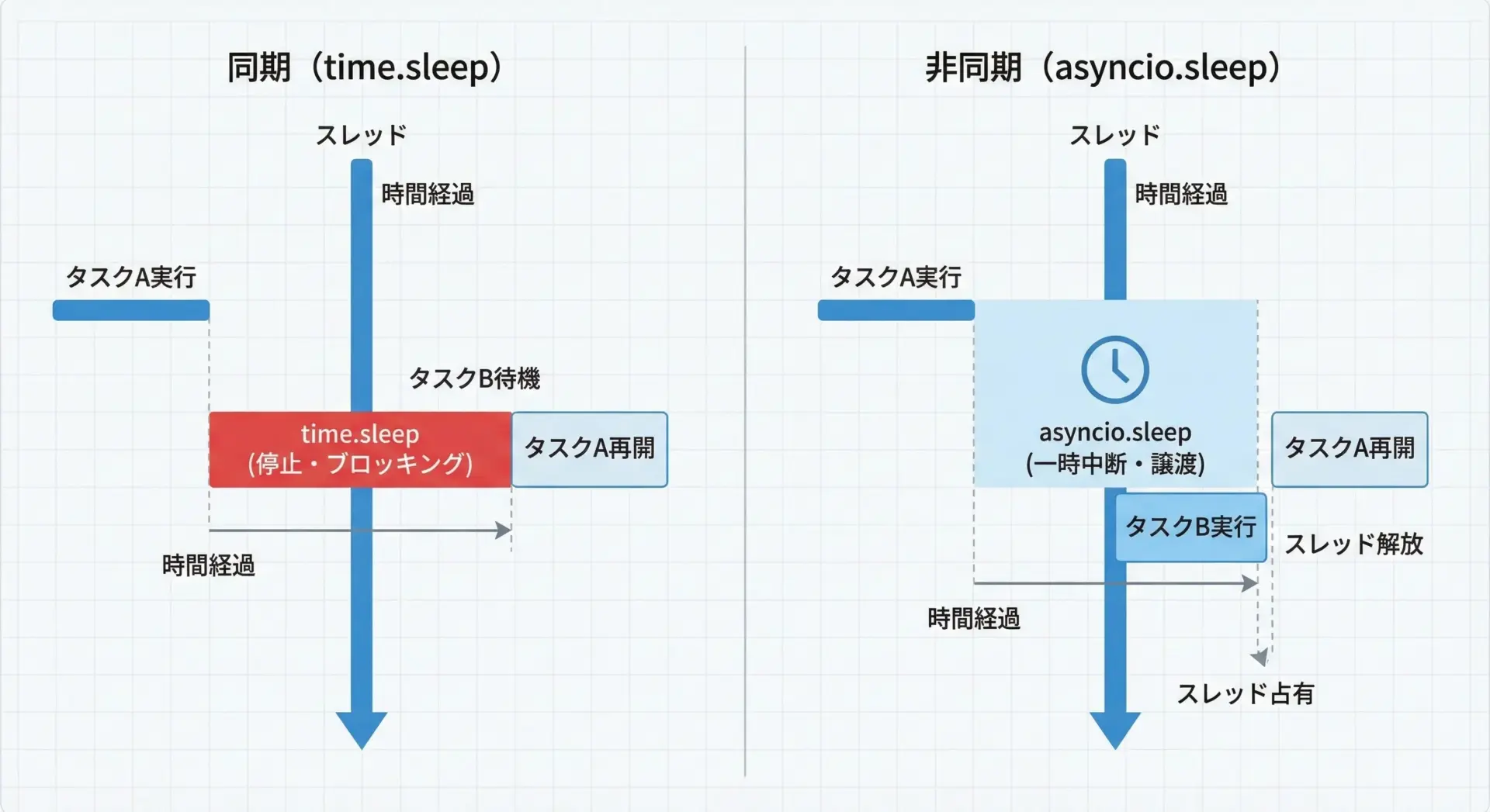 通常のtime.sleepは同期処理用であり、async def関数内で使うとイベントループをブロックしてしまうため、非同期コードではasyncio.sleepを使うことが重要です。