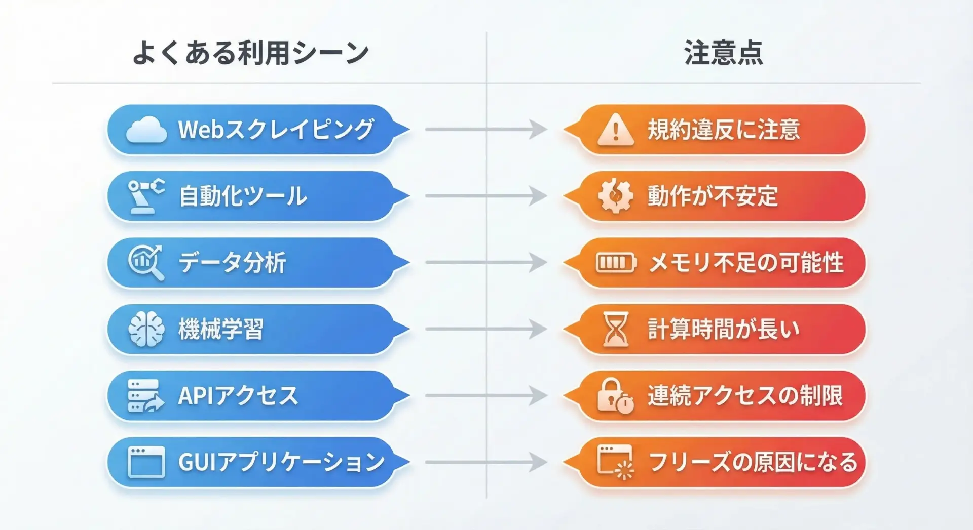 一方で、GUIやWebアプリのメインスレッド、テストコード、非同期処理などでは、そのまま使うとフリーズや性能低下を招くことがあります。