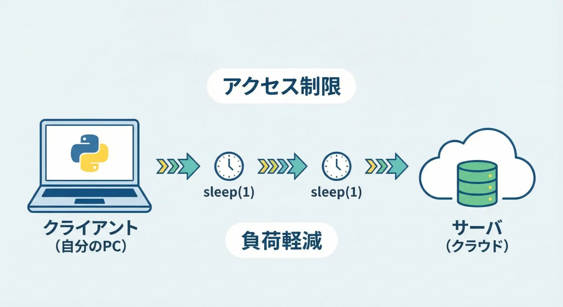 Web APIやスクレイピングでは、短時間に大量のリクエストを送ると、アクセス制限されたりサーバに負荷をかけてしまうことがあります。