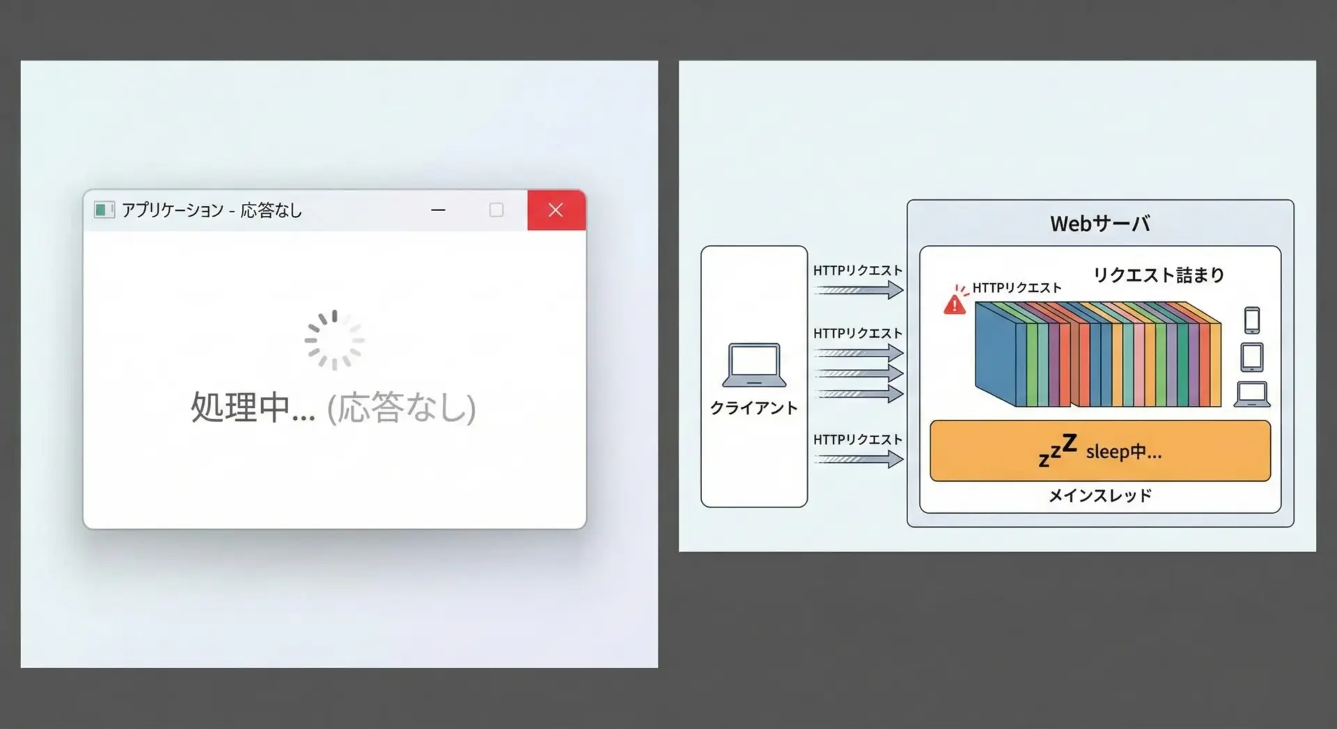 Webアプリの場合も同様で、1つのリクエスト処理がsleepしているあいだ、同じプロセス内の他の処理が詰まることがあります。