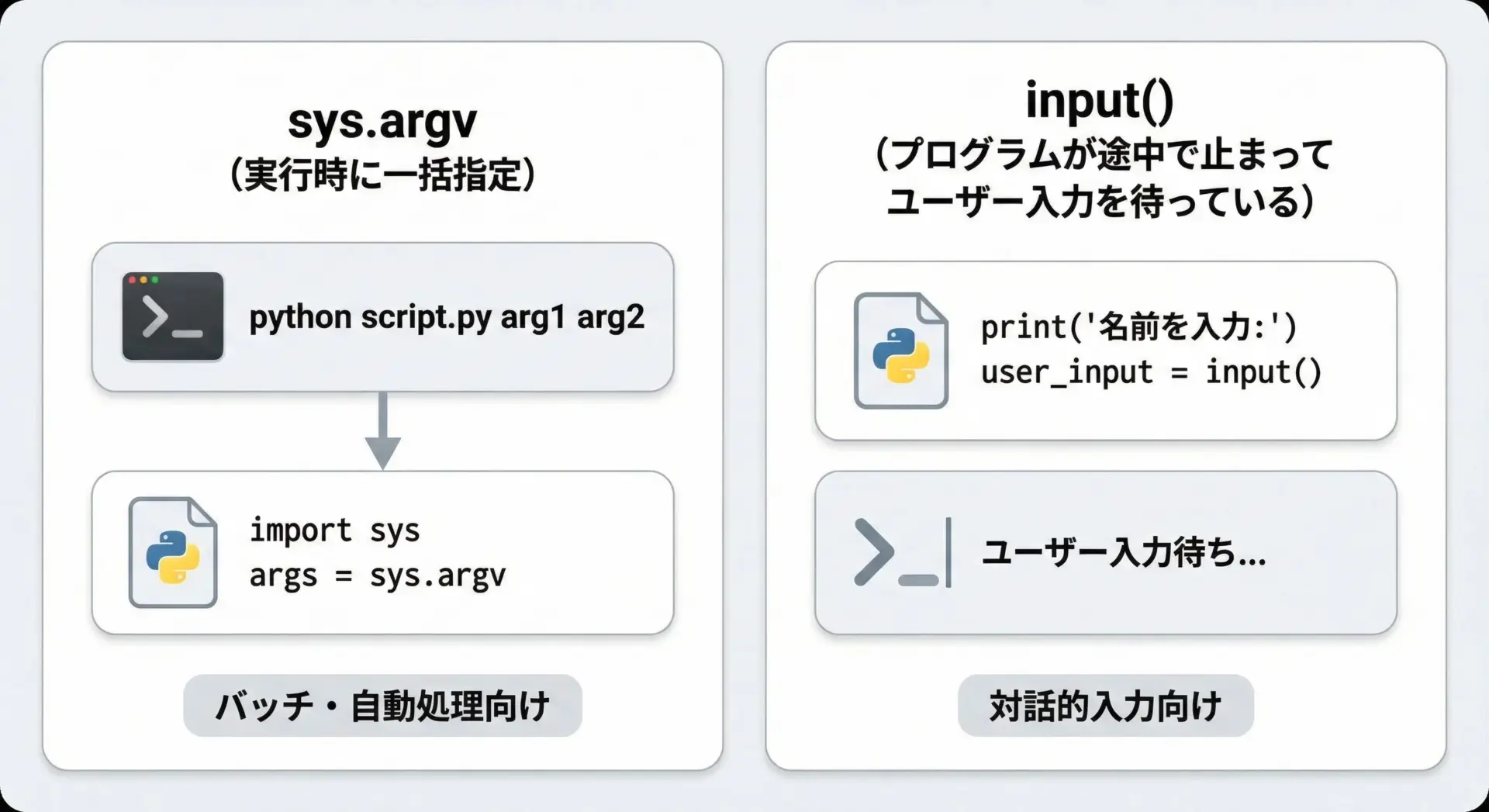 GUIやWebアプリでは別の入力方法(formやボタンなど)を使うことになりますが、シンプルなCLIツールではsys.argvとinput()をうまく使い分けるとよいでしょう。