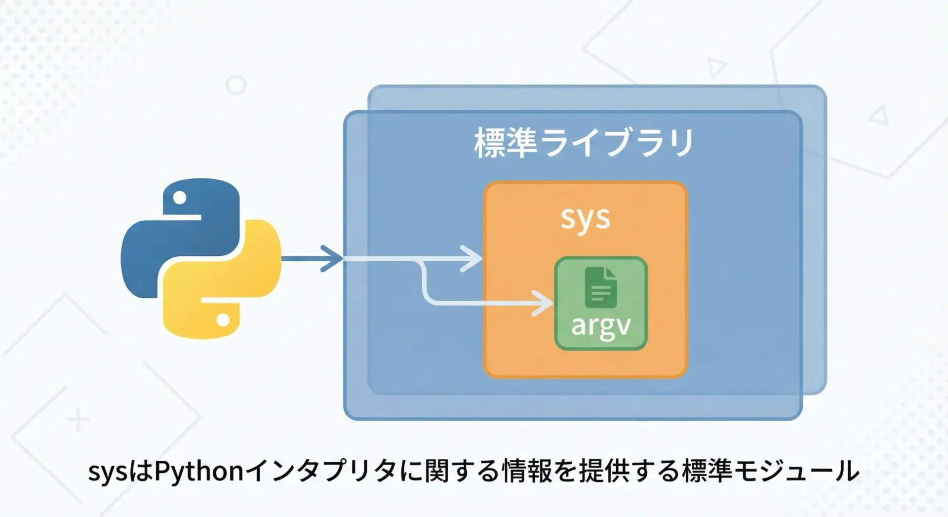 sysモジュールは、Pythonインタプリタに関する情報や機能を提供する標準ライブラリです。