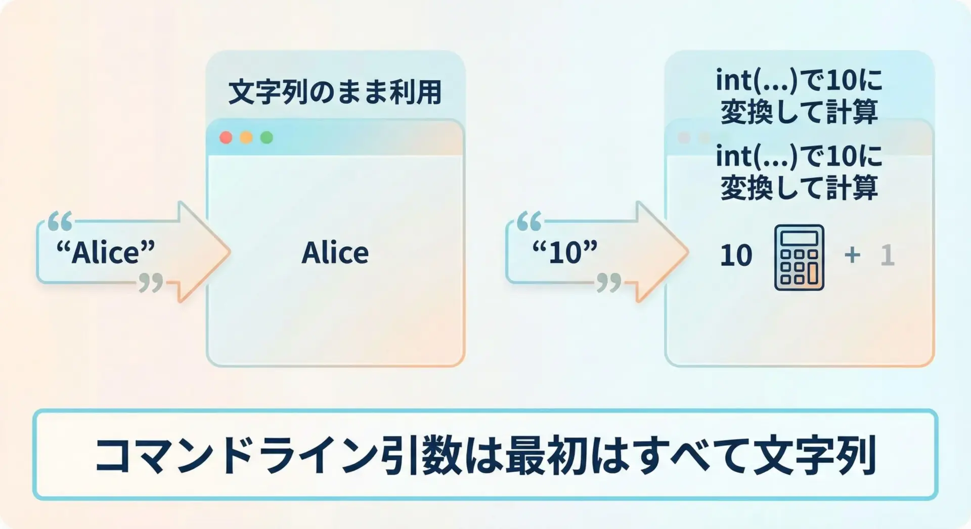 1つ目は、すべてのコマンドライン引数は「文字列」として渡されるという点です。