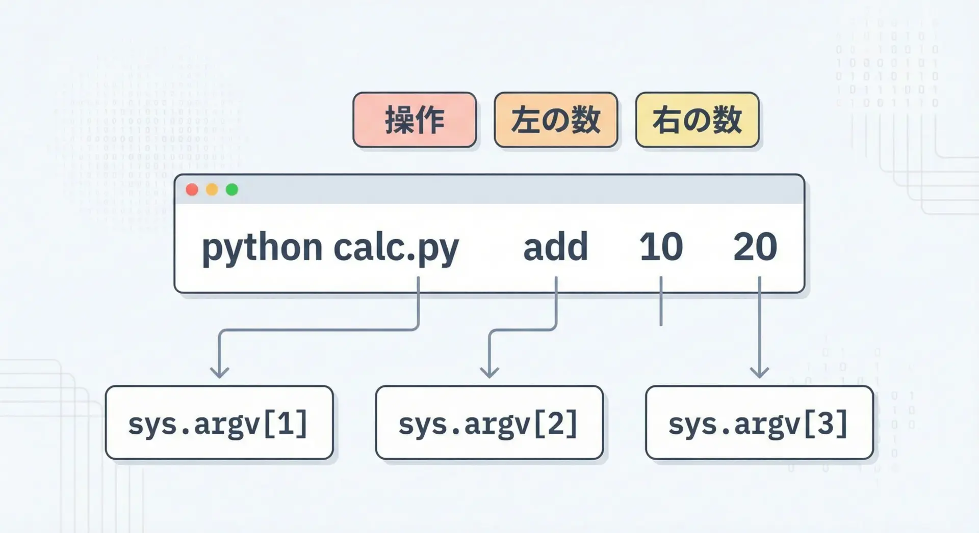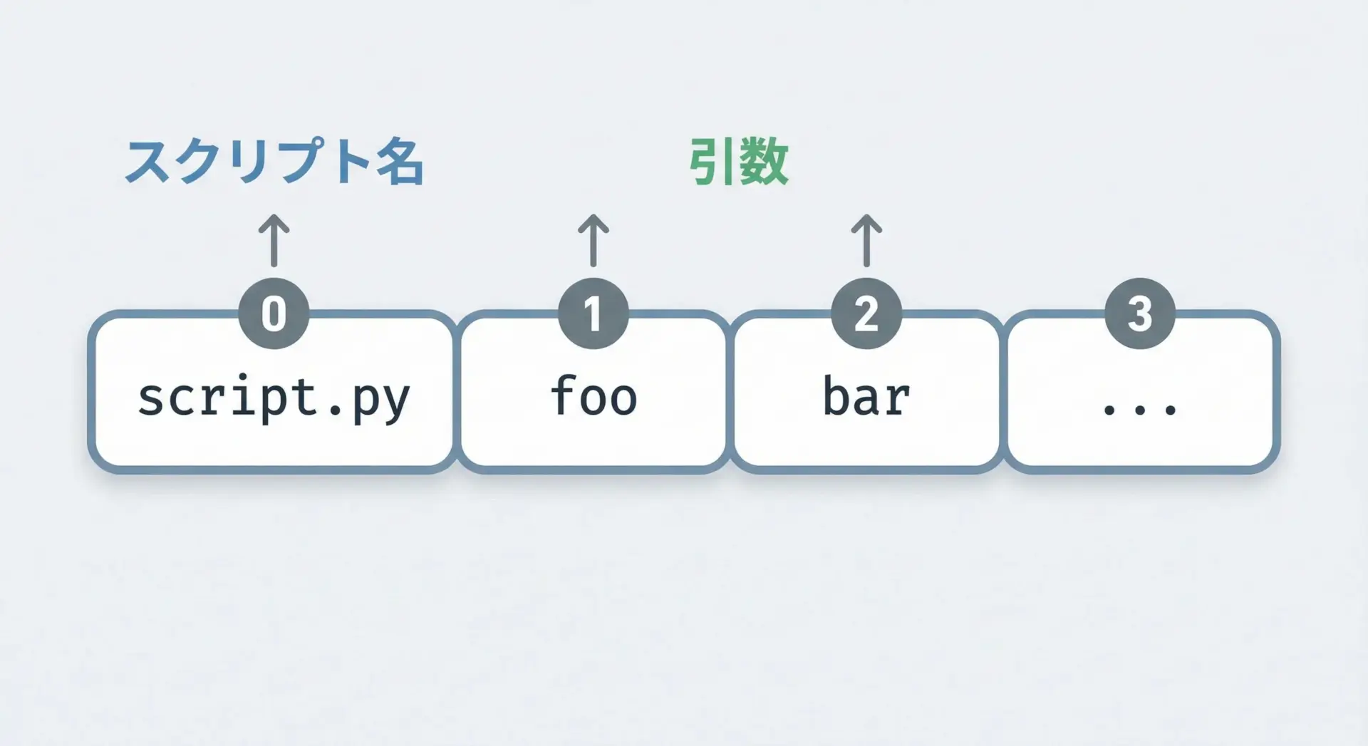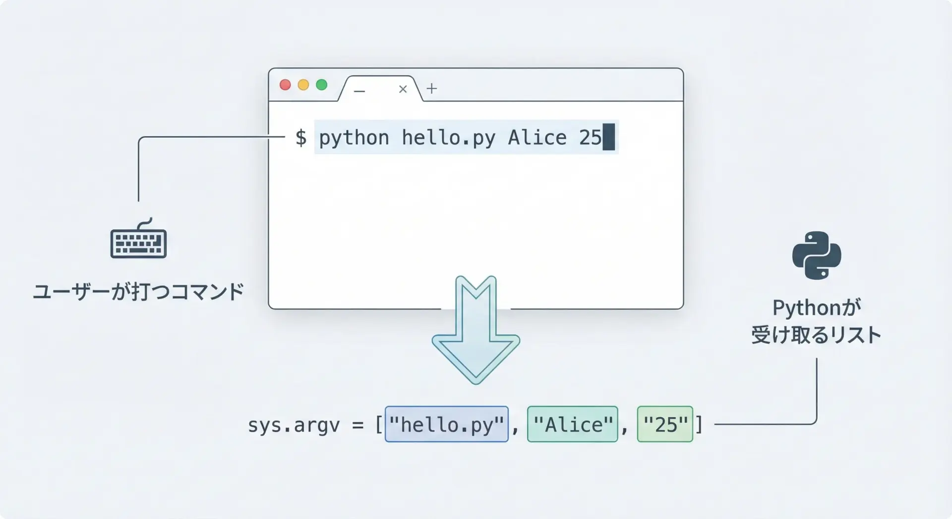 sys.argv[0]… 実行ファイル名(この例では"hello.py")sys.argv[1]… 1番目の引数"Alice"sys.argv[2]… 2番目の引数"25"