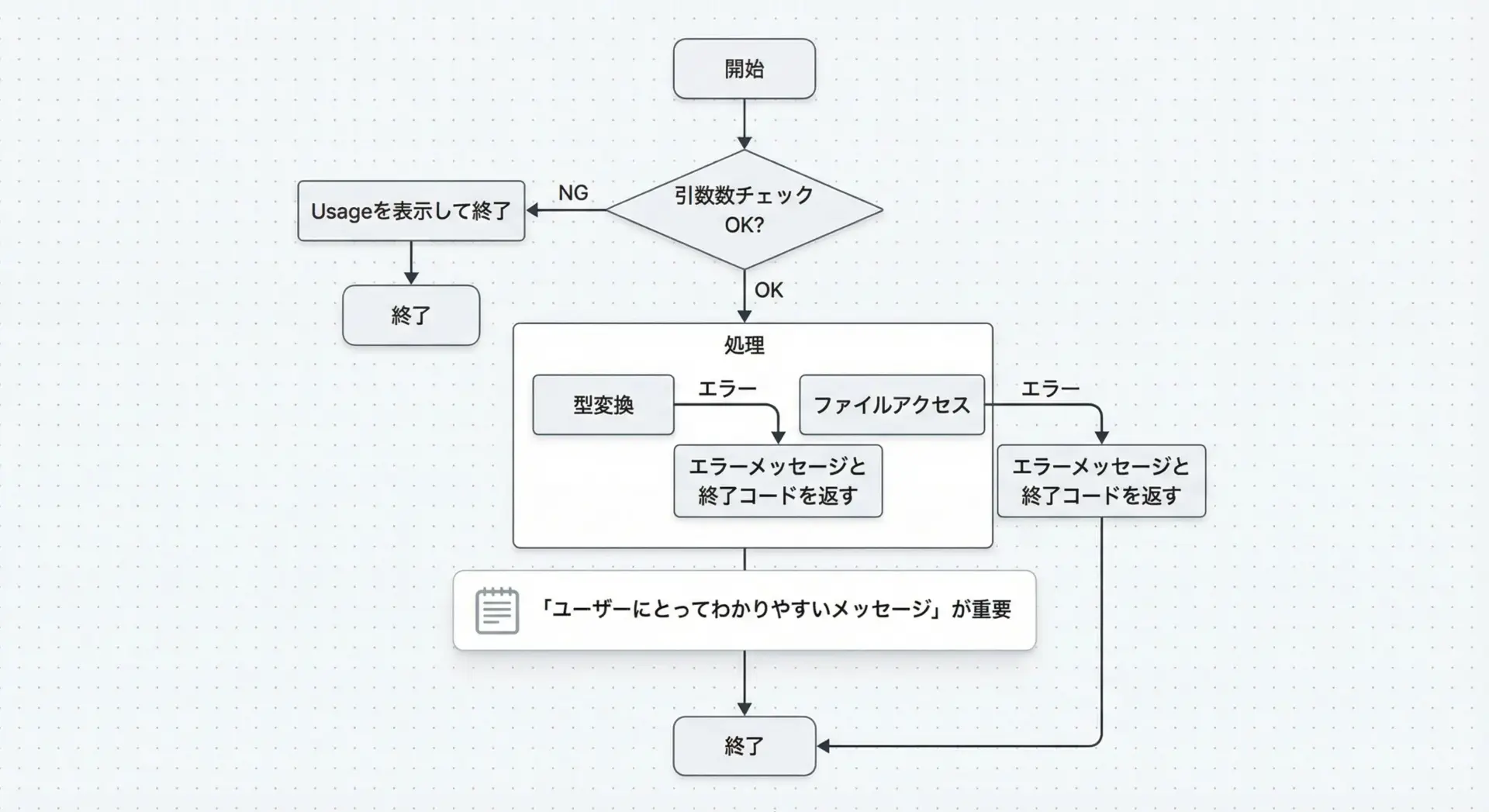 そのままトレースバックが出るよりも、「数値を指定してください」「ファイルが見つかりません」など、ユーザーが次に何をすればよいか判断しやすいメッセージを出した方が親切です。