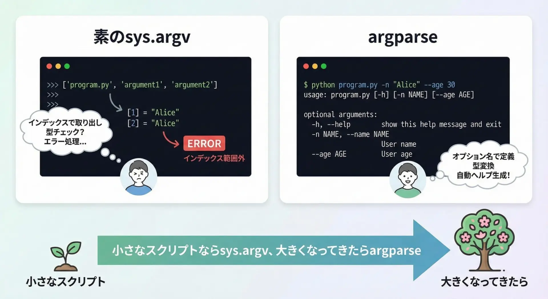 まずはここをしっかり理解しておくことで、その先のargparseや他のライブラリもスムーズに学べるようになります。