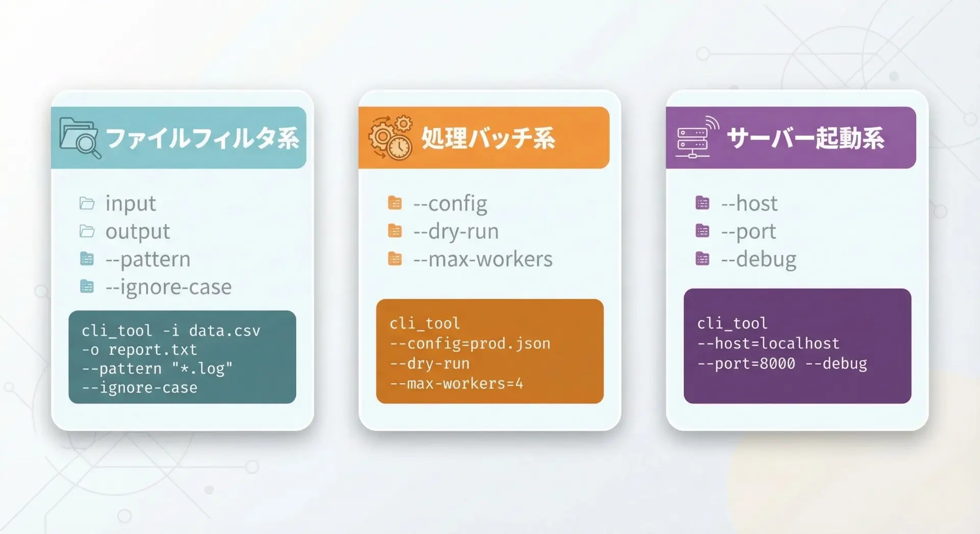 また、サーバー上でのバッチ処理やCIツールからの実行など、人が対話せずにプログラムを走らせるケースでは、コマンドライン引数がほぼ必須になります。