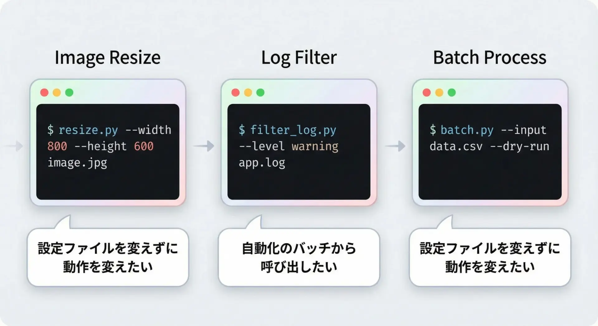 例えば、画像処理なら入力ファイル名やリサイズ後のサイズ、ログ解析なら対象のログレベルや期間など、毎回変えたいパラメータは引数で指定すると便利です。