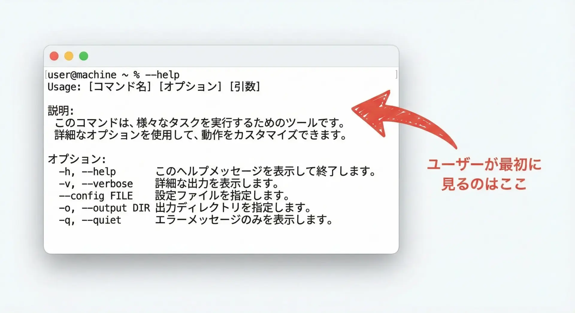 コマンドラインツールでは、引数の有無や値のチェック、エラーメッセージ、ヘルプメッセージの表示など、多くの処理が必要になります。