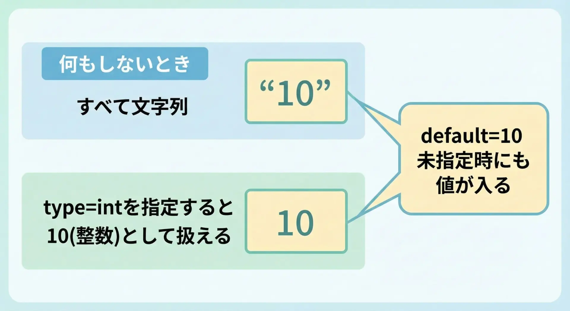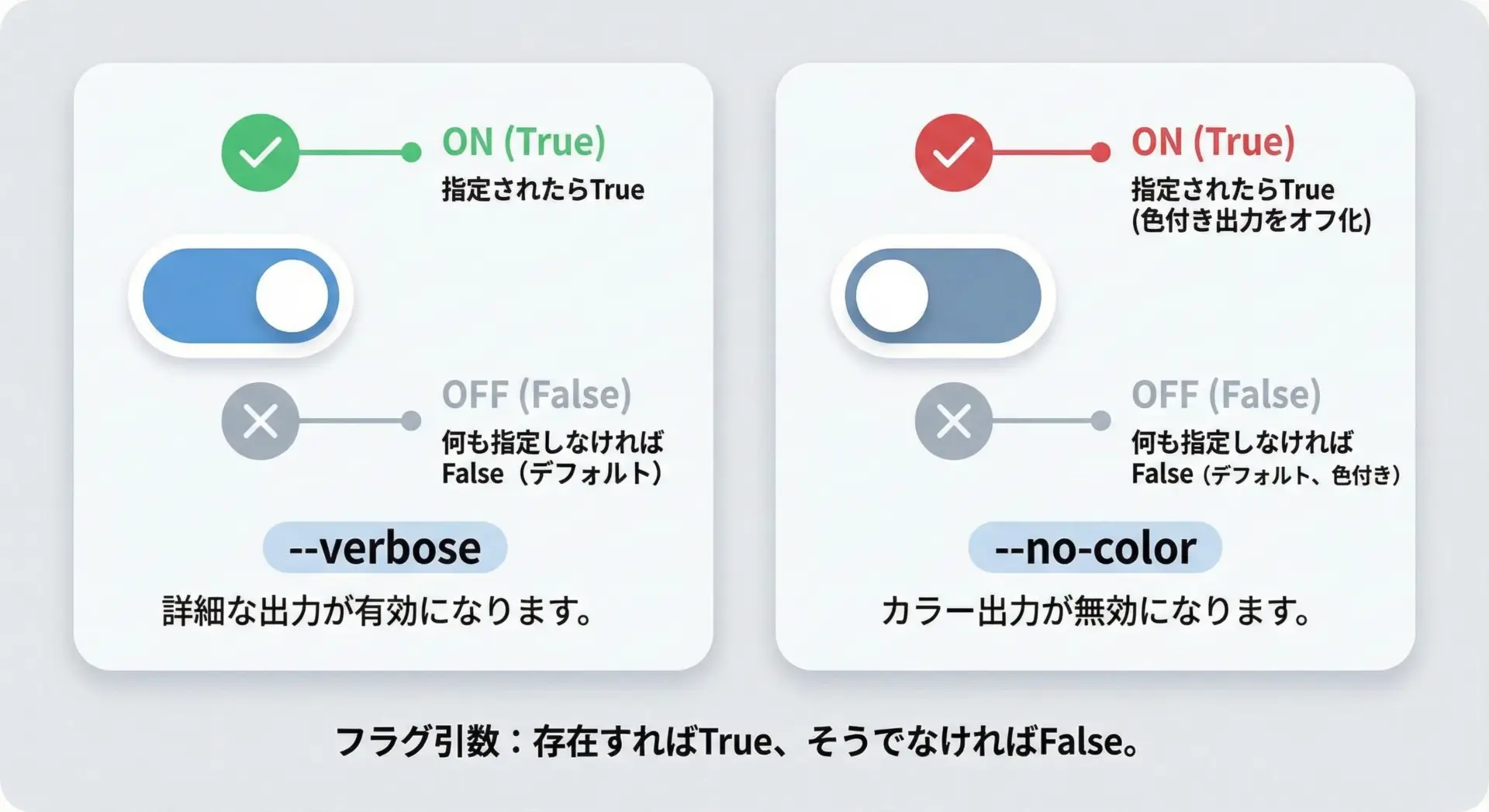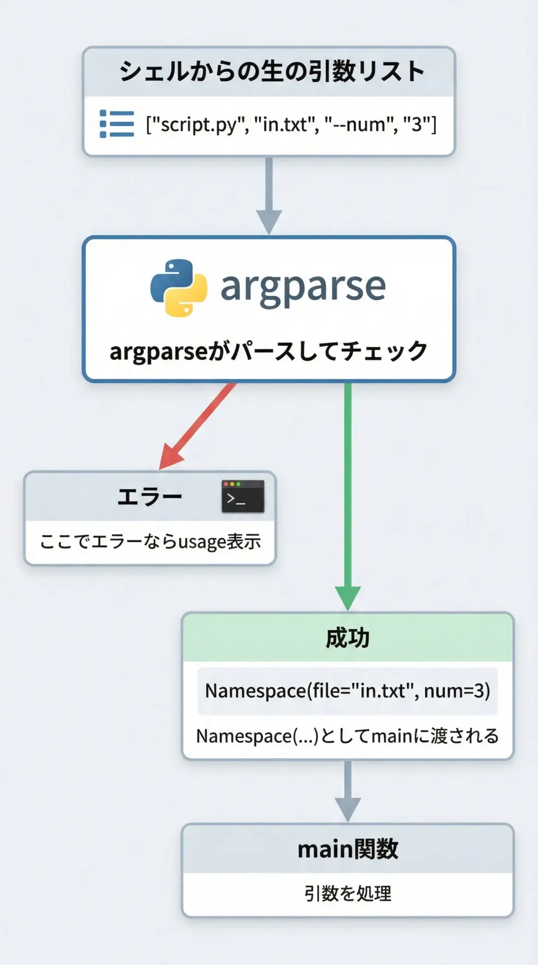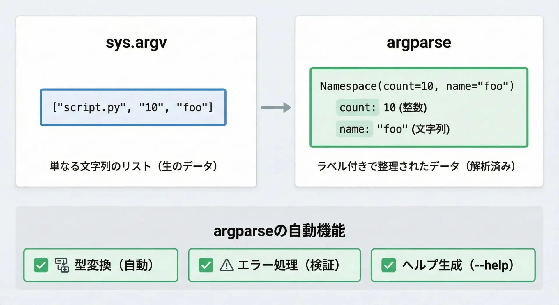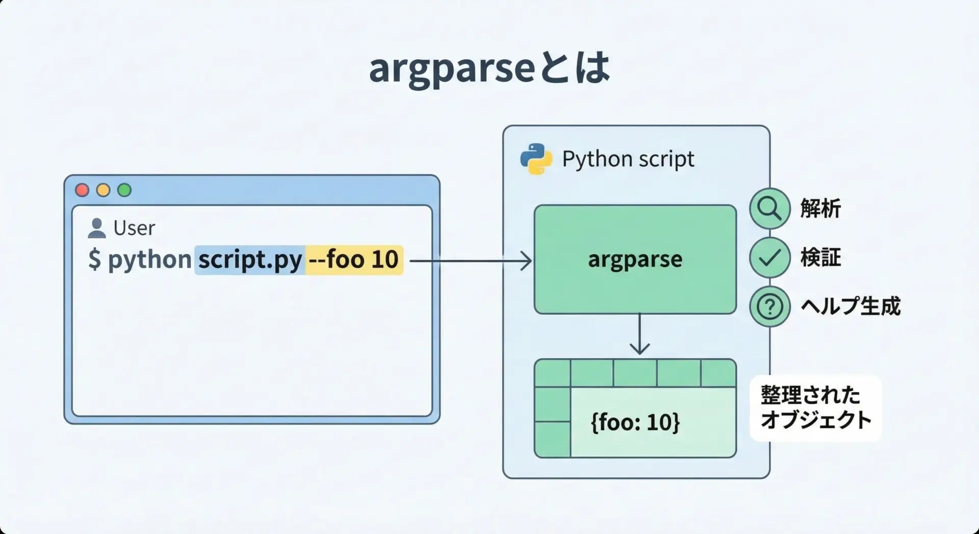 ユーザーがターミナルで入力した--input foo.txt-n 10といった文字列を、開発者が使いやすいPythonオブジェクトへ変換してくれます。