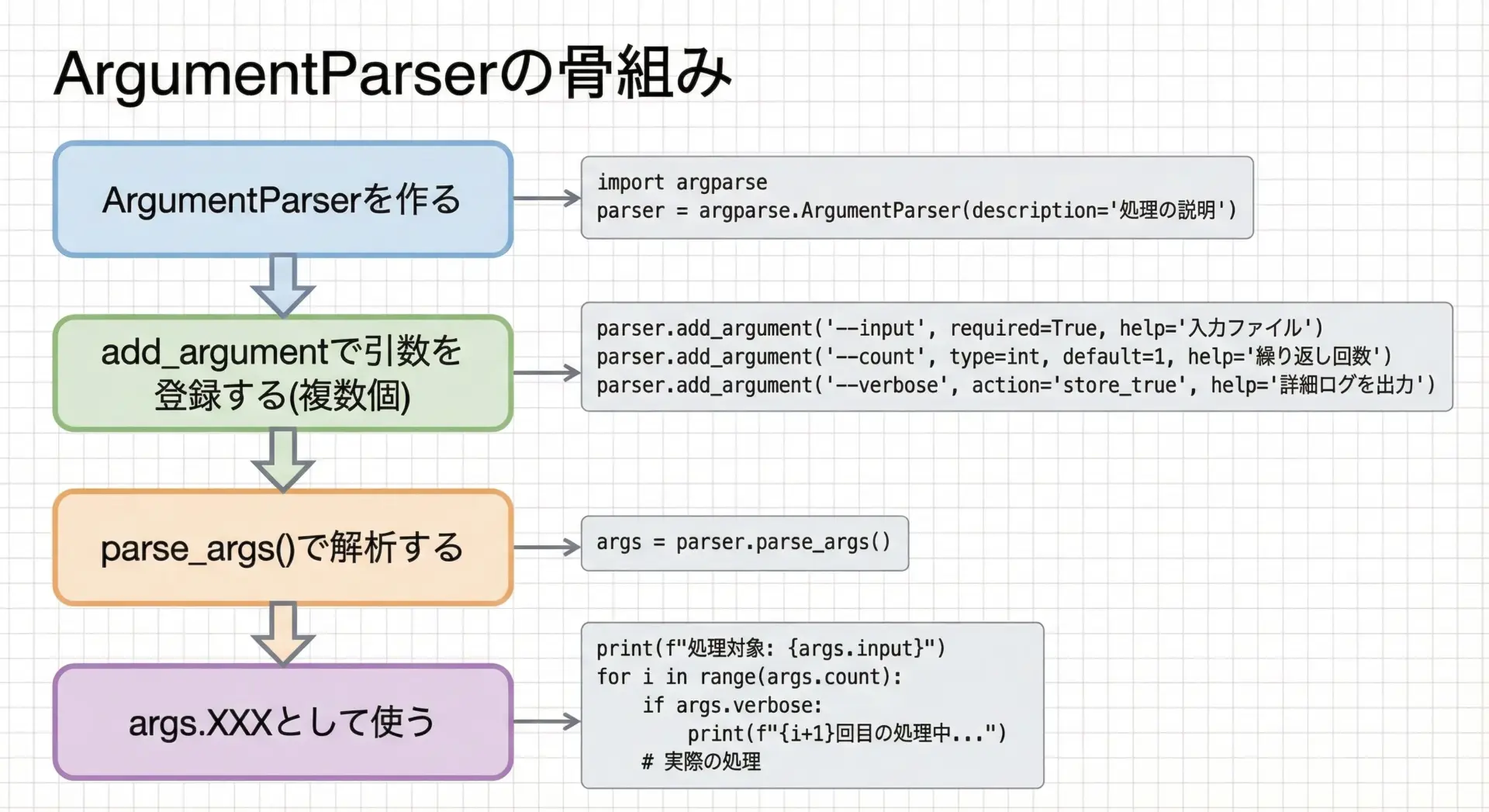 このように、「パーサー生成」「引数定義」「解析」「処理」の4ステップに分けて書くと、コードが整理されて読みやすくなります。