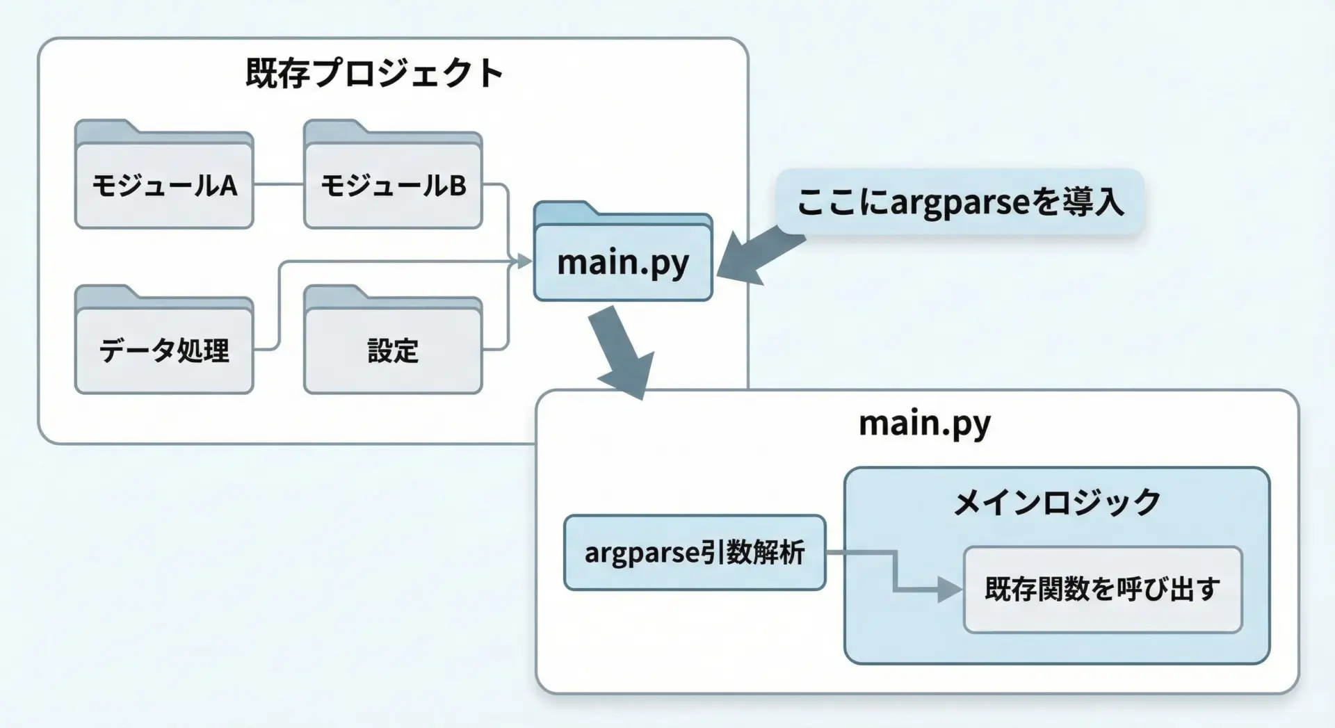 すでにある程度大きなプロジェクトにargparseを導入する場合は、次のポイントを意識するとスムーズです。